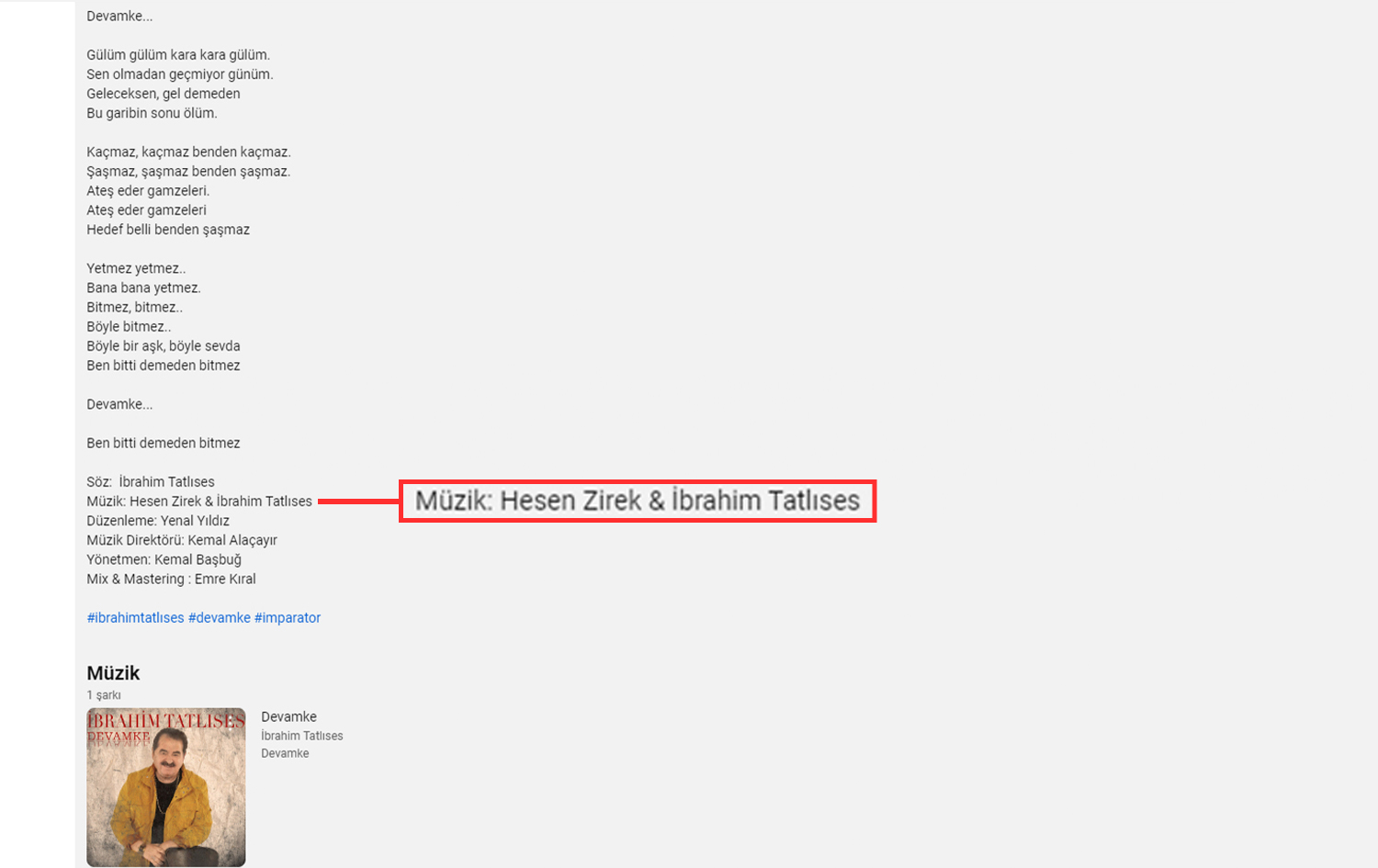 Erbil (Rûdaw) – Ünlü türkücü İbrahim Tatlıses geçtiğimiz günlerde çıkardığı "Devamke" single çalışmasını yayınladı. Tatlıses’in yeni şarkısı iki Kürt gencinin başını eserin asıl sahibi ile belaya sokmuştu. Herkes gibi Tatlıses de şarkının ünlü Kürd sanatçı Hesen Zirek’e ait olduğunu varsayarak "bestenin sahibi" kısmına onun adını yazdı. Ancak şarkının bestecisi davacı oldu ve şarkı yakında Youtube’den silinebilir.