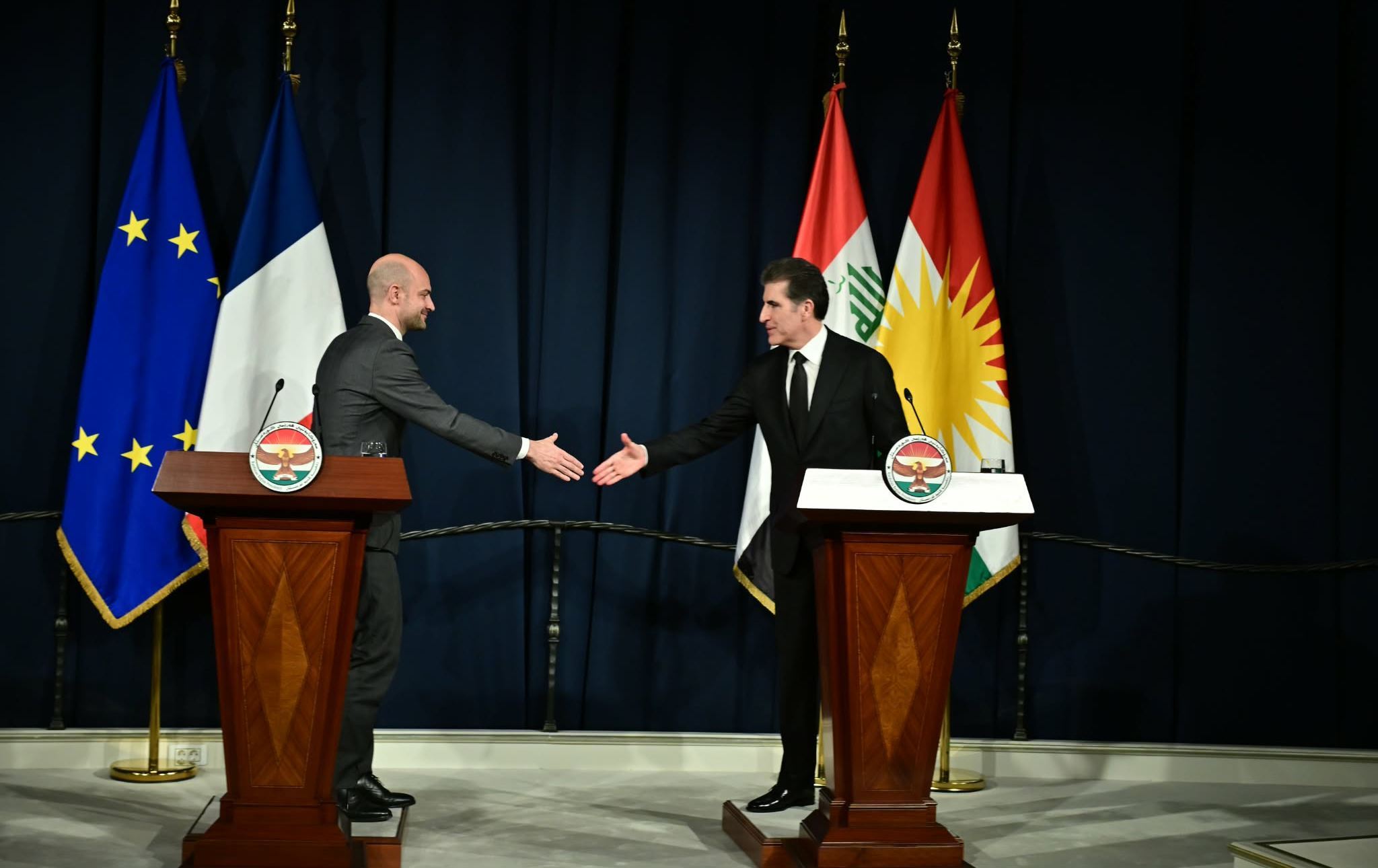 Fransa Dışişleri Bakanı Jean-Noël Barrot ile Kürdistan Bölgesi Başkanı Neçirvan Barzani, Erbil'deki görüşmelerinin ardından ortak bir basın toplantısı düzenledi.