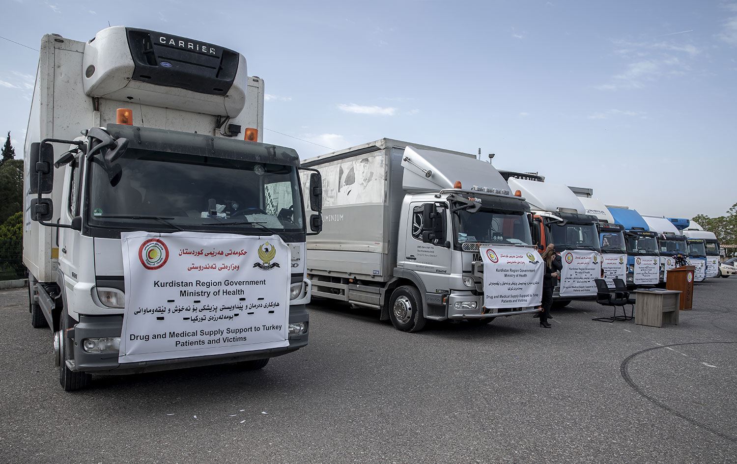 Haber Merkezi - Maraş merkezli depremlerden etkilenen illere 50 tonluk tıbbi yardımı taşıyan 8 tır Erbil'den yola çıktı.