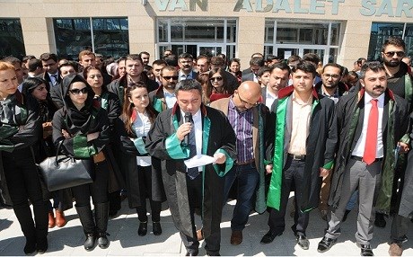 Van Barosu üyesi avukatlar, bugün Van Adliye Sarayı önünde toplanarak otuma eylemi ile durumu protesto etti.