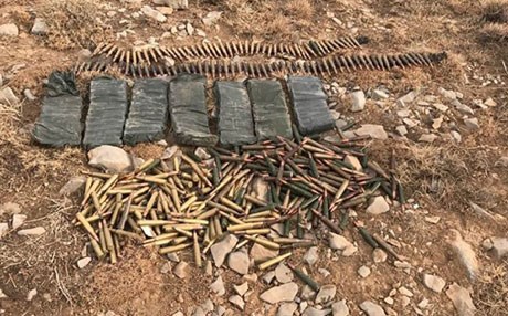 Güvenlik güçleri arazide yaptıkları incelemede, kaleşnikof, uzun namlulu silahlar, mermi ve bomba buldu.
