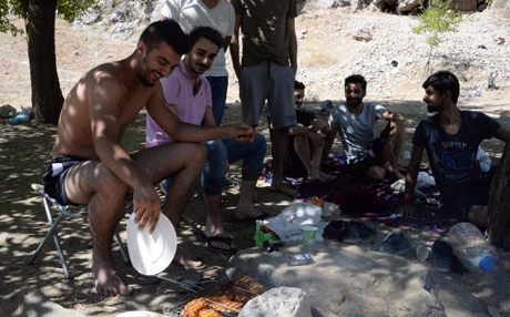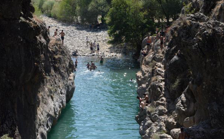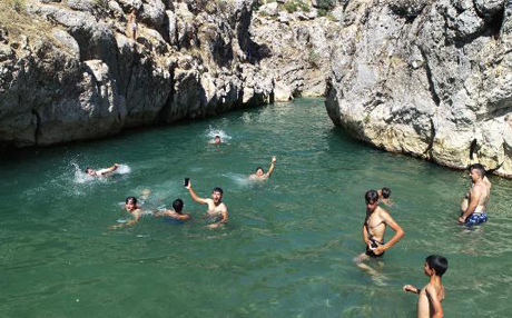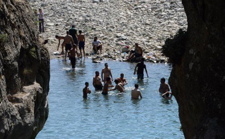 Vatandaşlar bir yandan Birkleyn Mağaraları'nda çıkan buz gibi suyun kenarında piknik yapıyor, diğer yandan da yüksek kayalıklardan suya atlayıp serinliyor.
