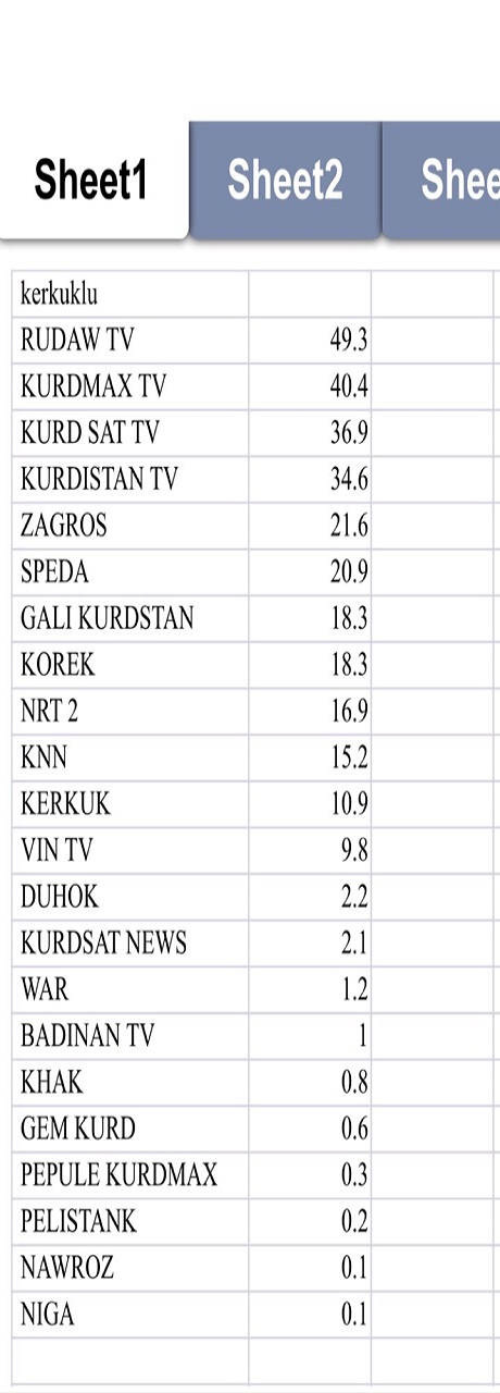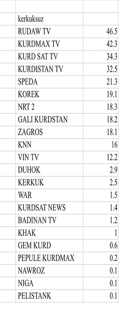 Anket sonuçlarına göre, Rûdaw TV, izleyicilerin en çok tercih ettiği kanal oldu.