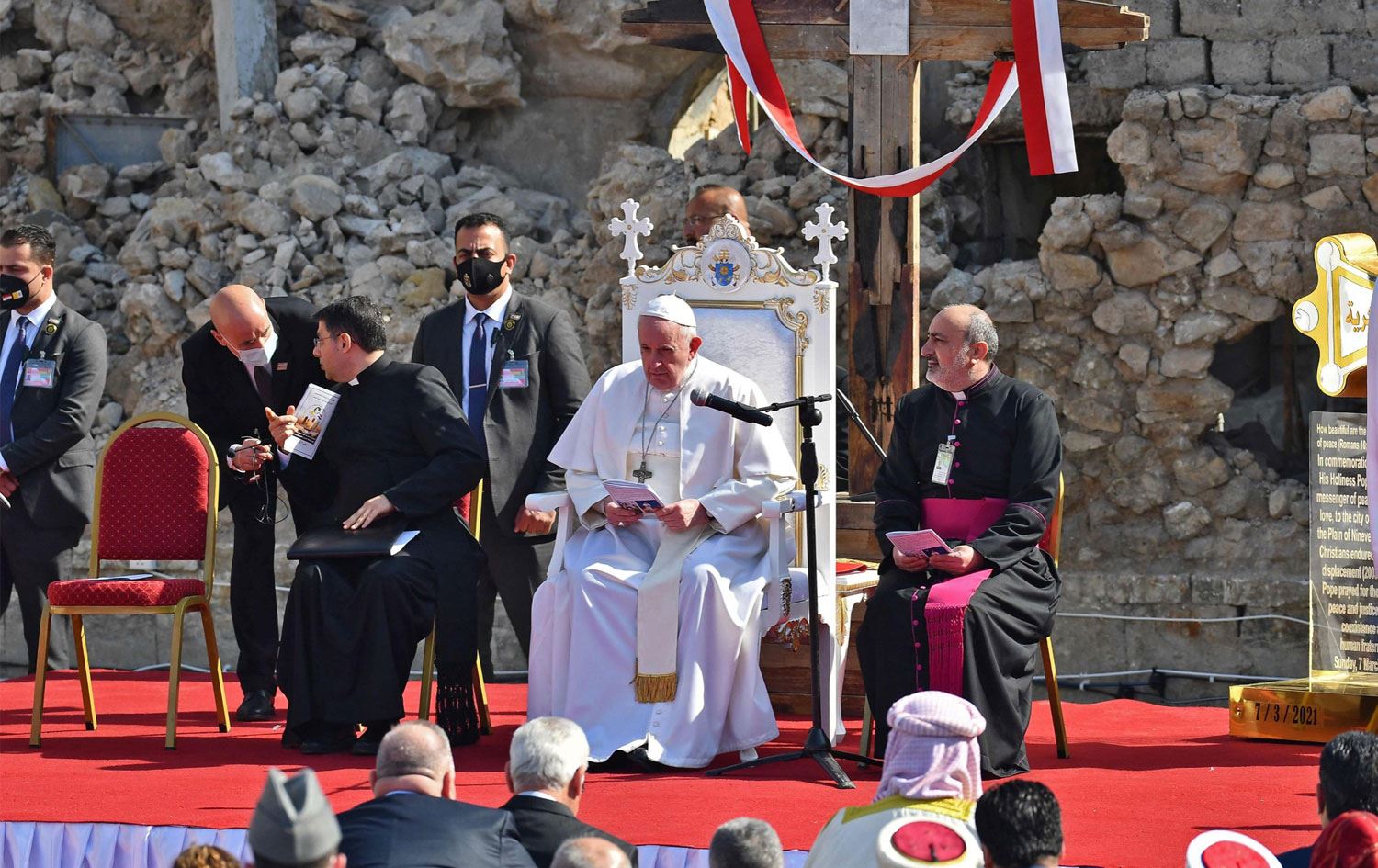 IŞİD’in 2014-2017 yılları arasında işgal ettiği bölgede bulunan ve örgüt tarafından yıkılan kiliselerin yer aldığı 4 Kilise Meydanı'na giden Papa burada "tüm savaş ve silahlı çatışmaların mağdurları için" dua etti.
