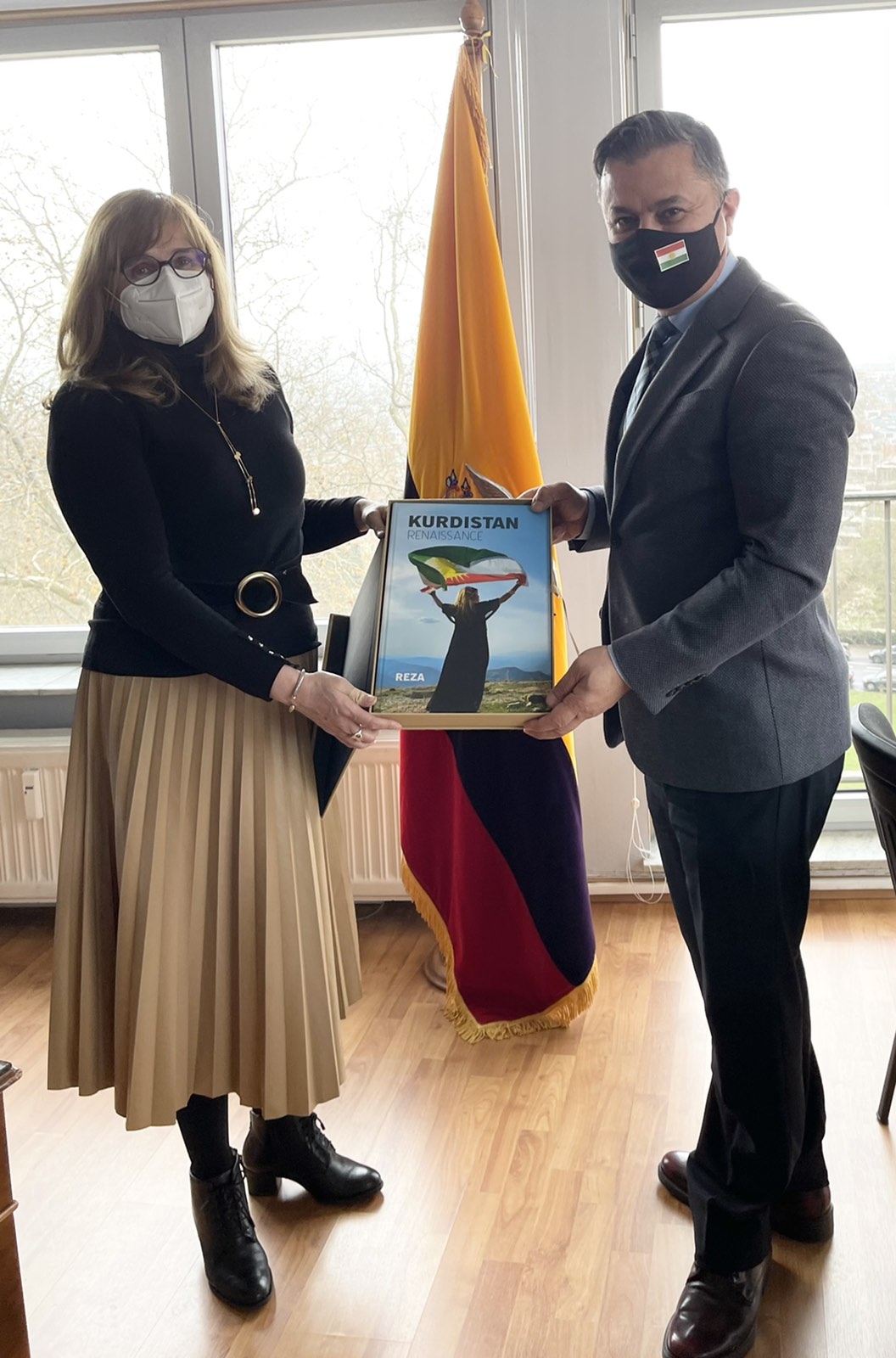 Dilawer Ajgeyi, “Ayrıca Ekvador Cumhuriyeti’nin Avrupa Birliği Elçisi Albornoz’a Kürdistan’ı anlatan bir de kitap hediye ettik” ifadelerini kullandı.