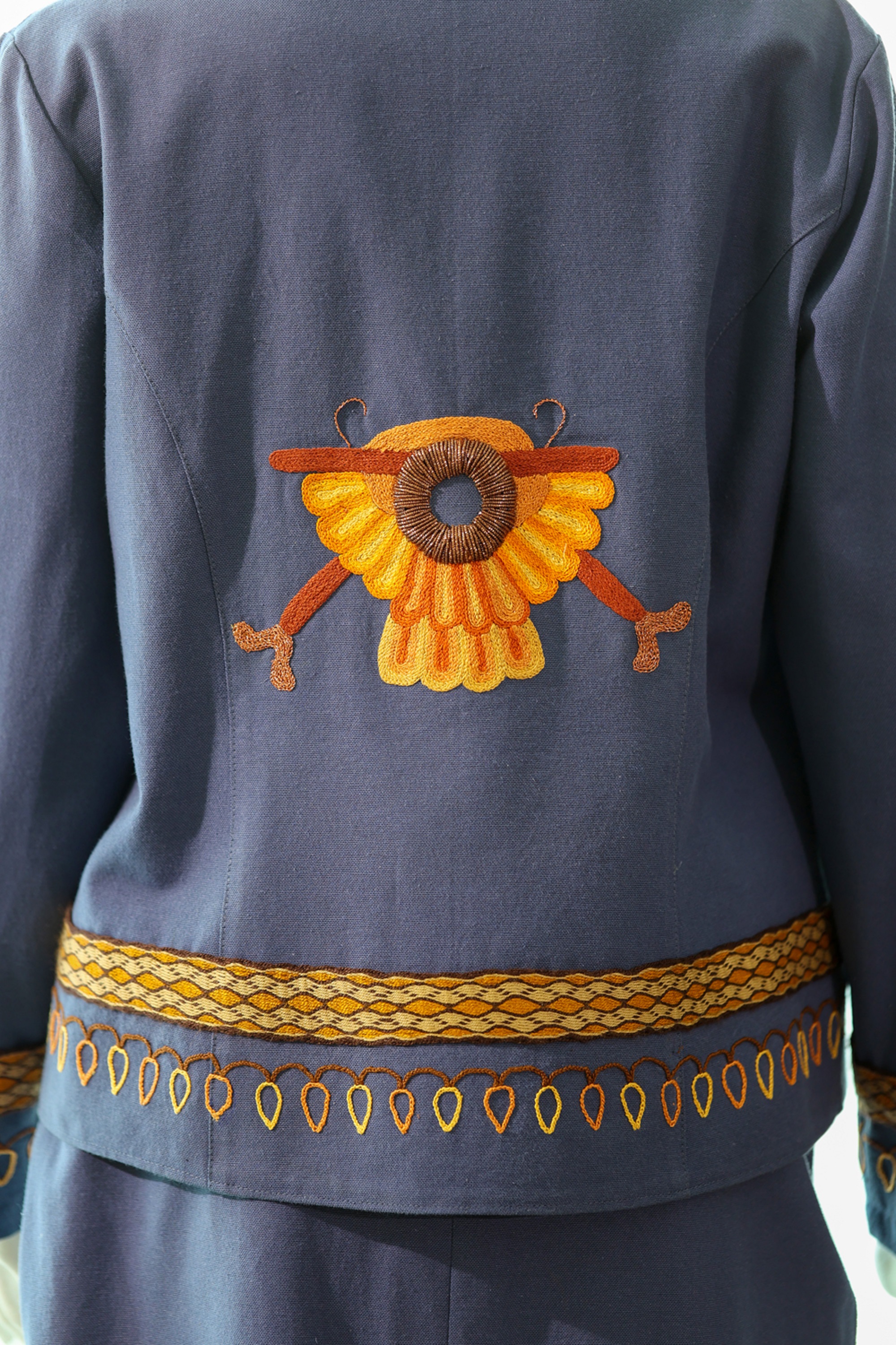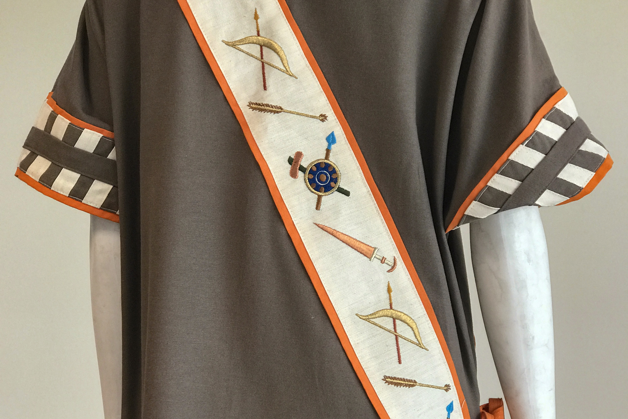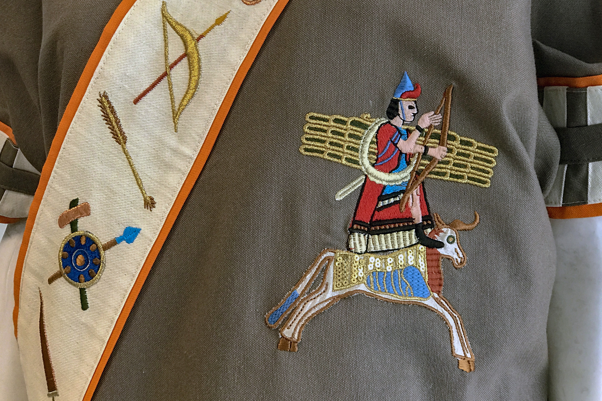 Özel kumaşlardan dikilen kadın kıyafetlerinin üzerine Urartu döneminde kullanılan bronz kemer, kalkan, miğfer, saç tokası, mühür, bilezik, gerdanlık, hayat ağacı, güneş, hayvan ve bitki sembolleri ile kabartma ve mimari eserlerdeki motif örnekleri ustalıkla işlendi.