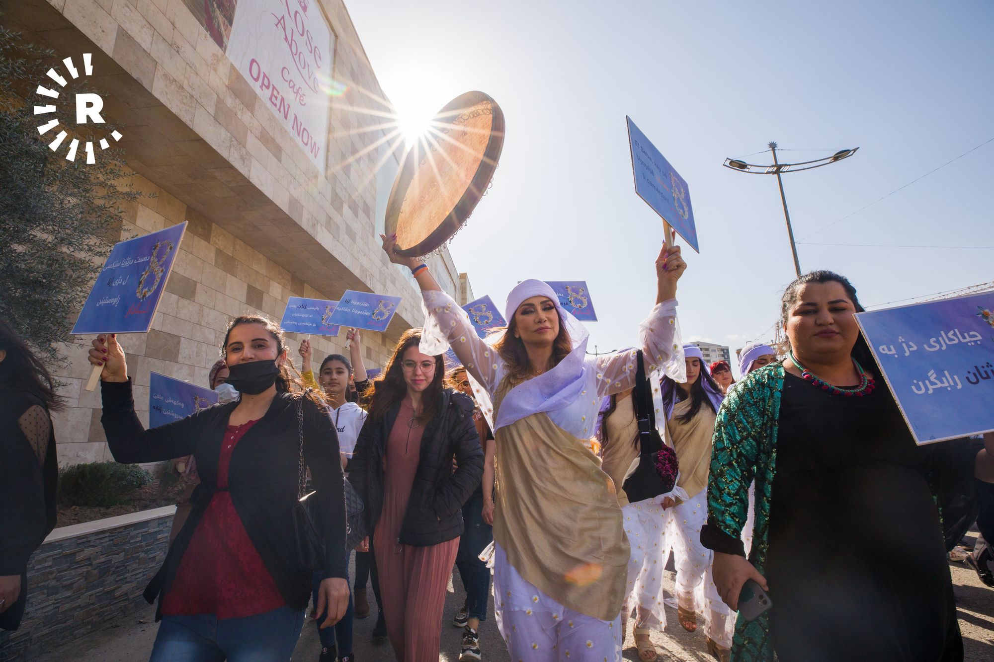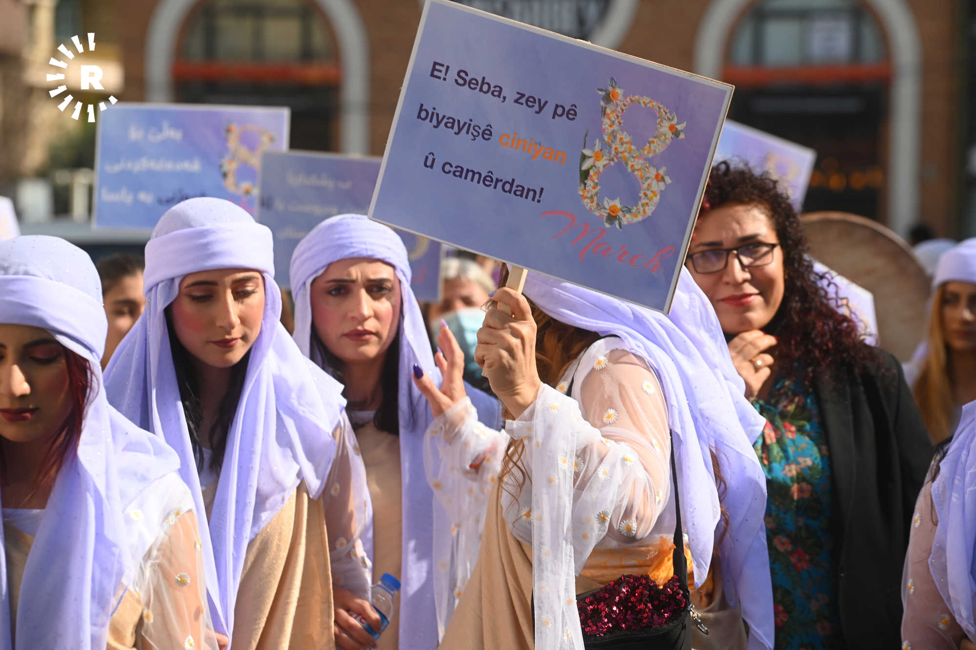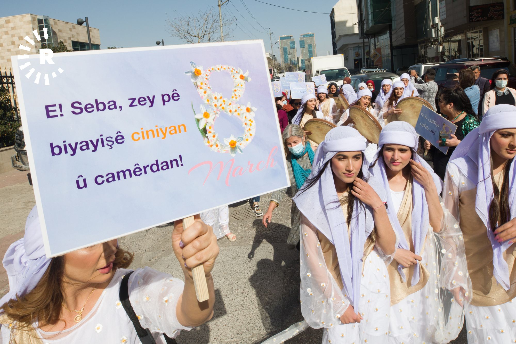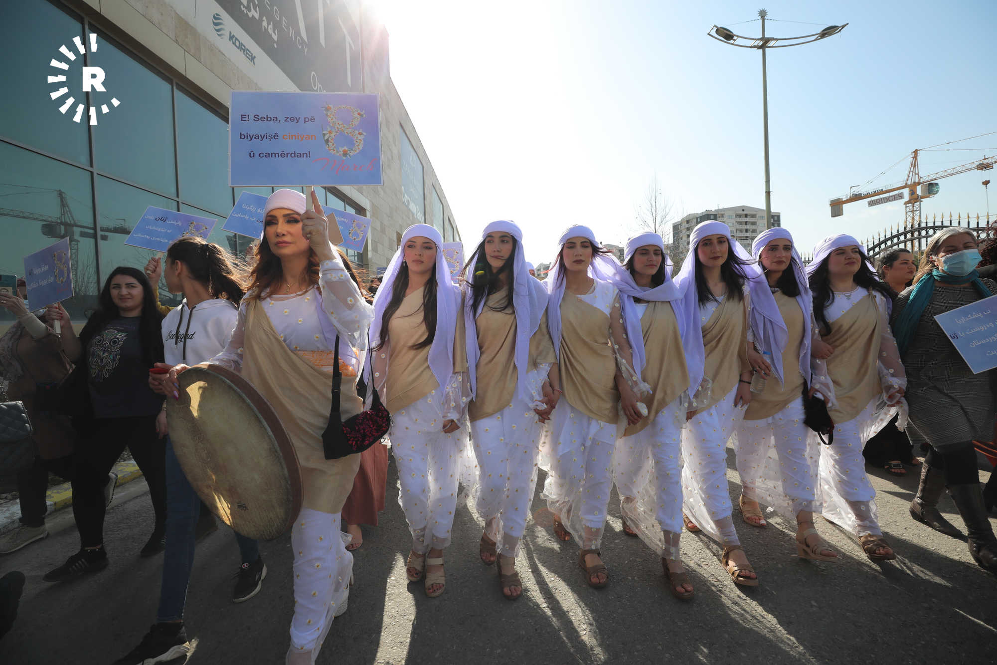 Başkent Erbil’deki Dara Şakran Kampı’nda kalan Rojavalı ve Ezidi kadınlar, Erbil caddelerinde def ve kaval çalarak 8 Mart yürüyüşü gerçekleştirdi.