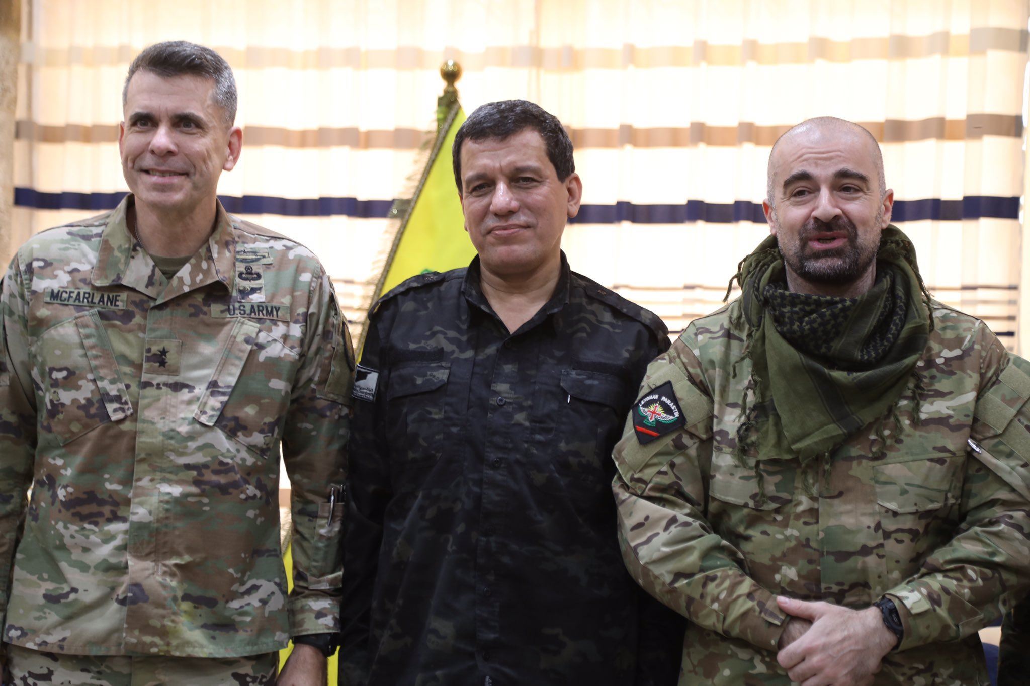 Soldan sağa: IŞİD Karşıtı Koalisyon Komutanı Tümgeneral Matt McFarlane, DSG Genel Komutanı Mazlum Abdi, KYB Genel Başkanı Bafıl Talabani / Rojava Foto: Mazlum Abdi Twitter hesabı