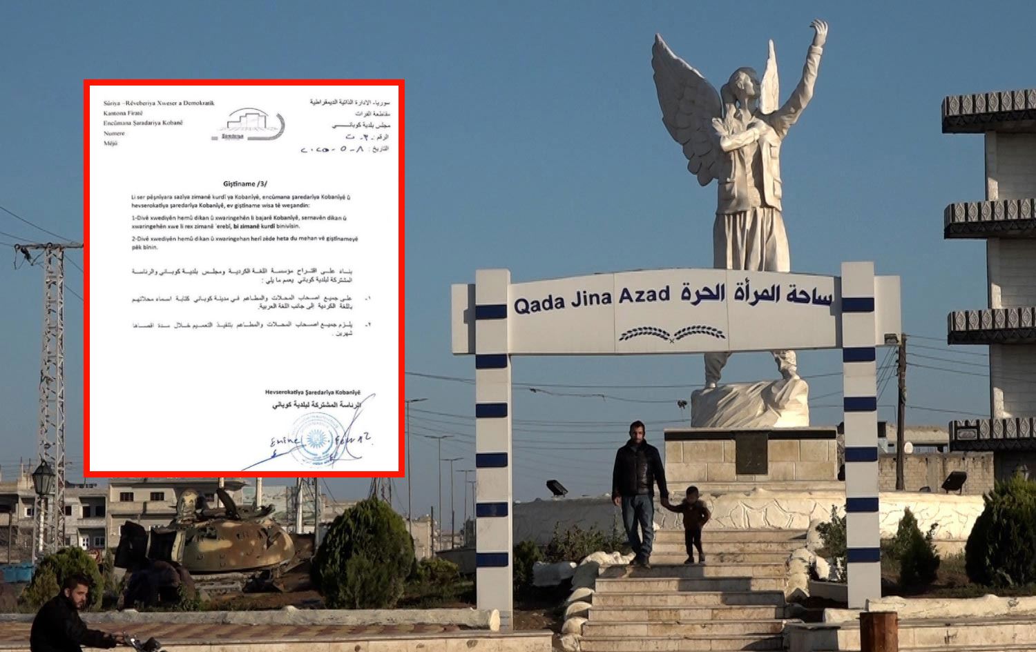 - Kobani’deki tüm dükkân ve lokanta sahipleri, işletme isimlerini Arapça tabelaların yanına Kürtçe olarak da yazmakla yükümlüdür.