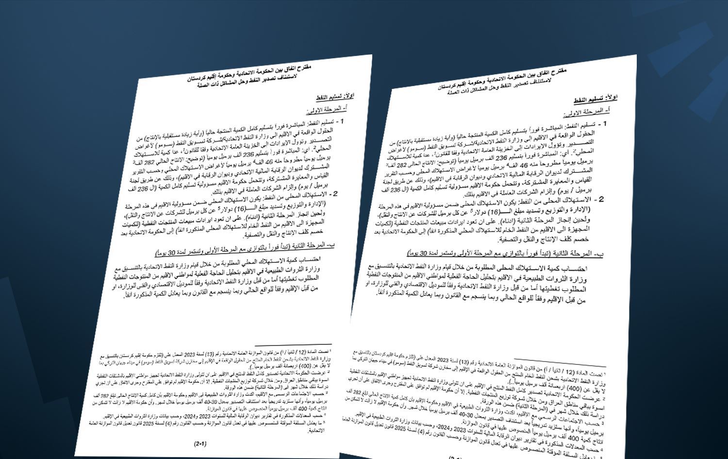 1. Petrol teslimi: Kürdistan Bölgesi derhal petrol sahalarında şu anda üretilen tüm petrol miktarının (gelecekte üretimdeki herhangi bir artışla birlikte) ihracat için Federal Petrol Bakanlığı/Petrol Pazarlama Şirketi'ne (SOMO) teslim edilmesine başlanacak ve gelirleri yasaya göre (1) Federal Genel Hazine'ye teslim edilecek. İç tüketim miktarı hariç (2), yani derhal günlük 236 bin varil petrol teslimi (açıklama: mevcut üretim günde 282 bin varil (3) olup bunun 46 bin varili (4) iç tüketim için çıkarılmaktadır ve Federal Mali Denetim Kurumu ile Bölge Denetim Kurumu ortak raporuna göre) bu ortak ölçüm ve standartlar komisyonu aracılığıyla uygulamaya konulacaktır. Kürdistan Bölgesi tüm bu miktarın (günde 236 bin varil) teslimi ve Kürdistan Bölgesi’nde faaliyet yürüten şirketlerinin buna bağlı tutulması sorumluluğunu üstlenir.