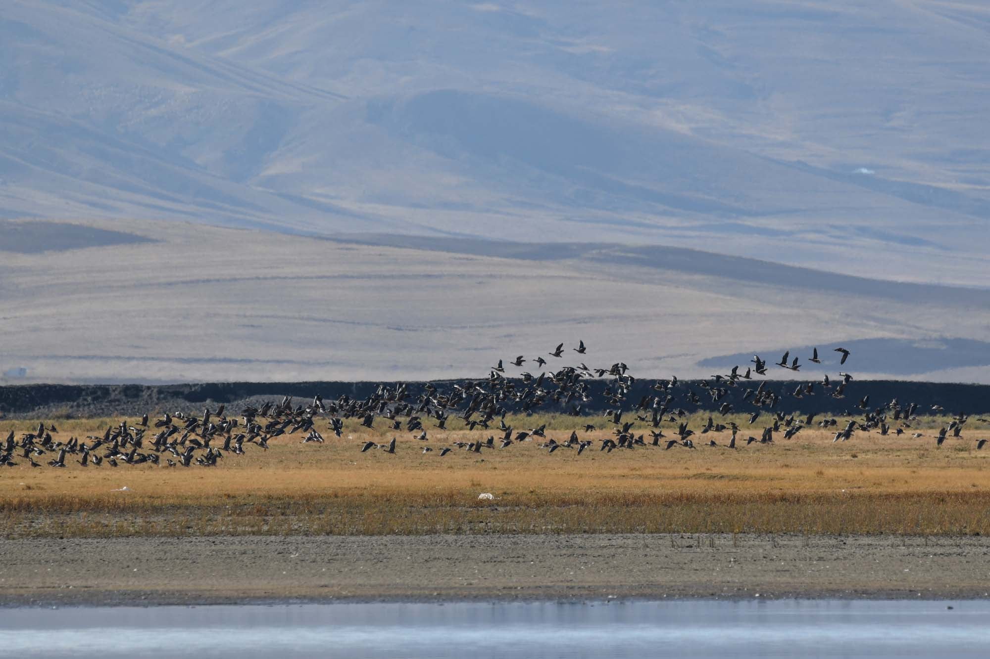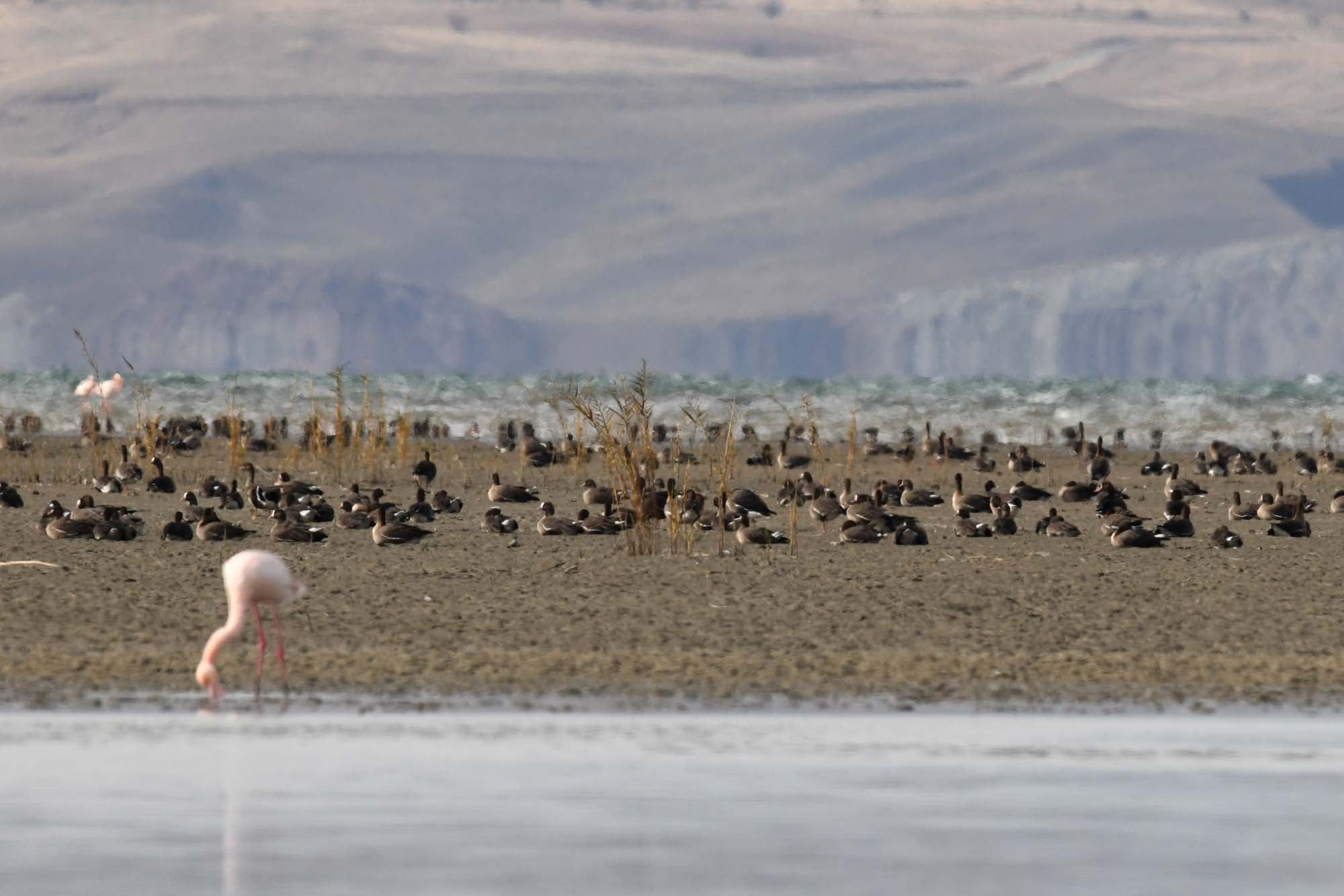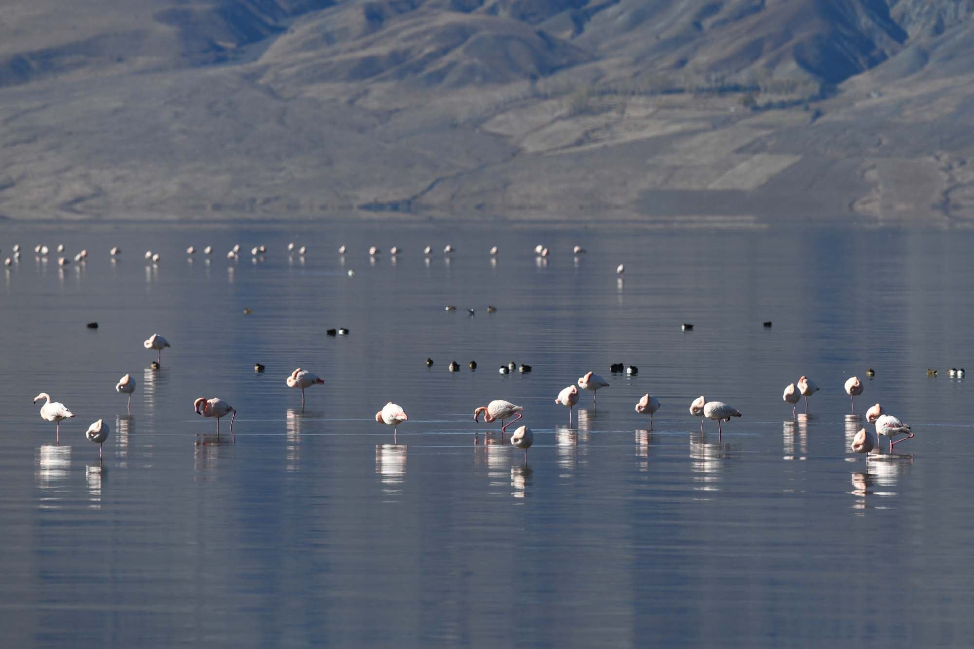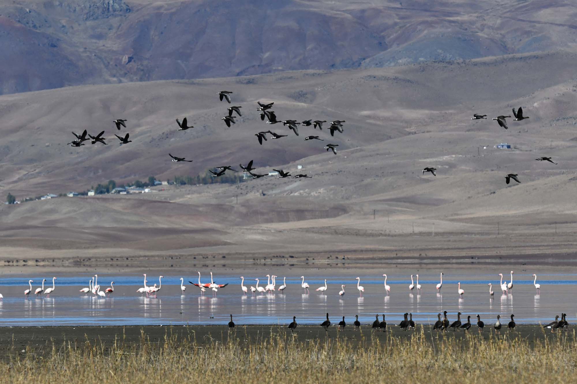 Kuş cenneti olarak anılan Van'ın İpekyolu ilçe sınırında bulunan Erçek Gölü, bu yıl flamingoların yanı sıra yaban kazlarını da barındırıyor.