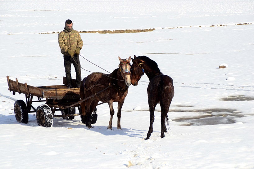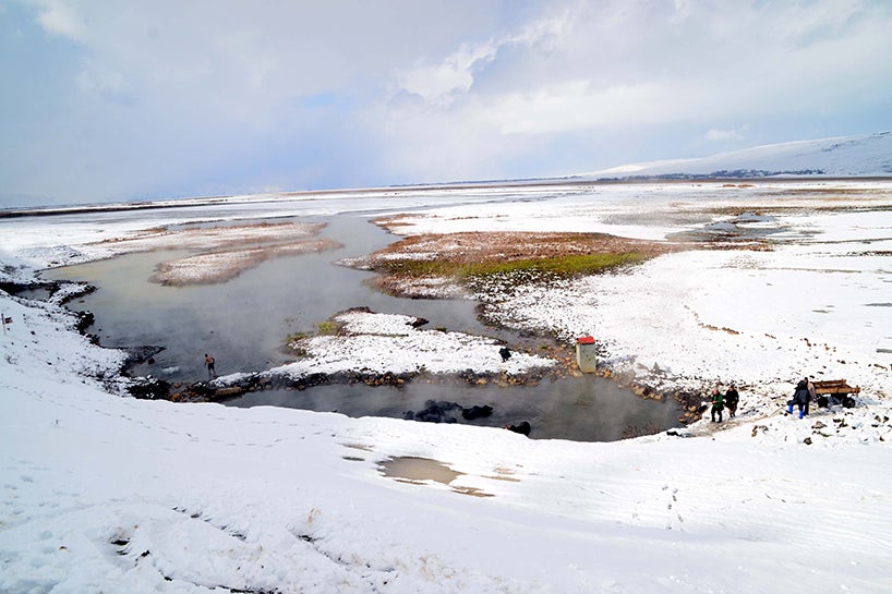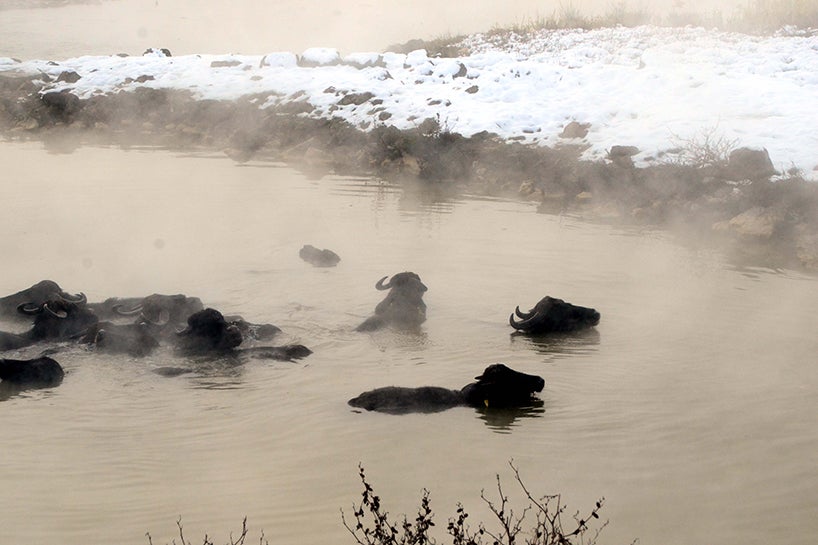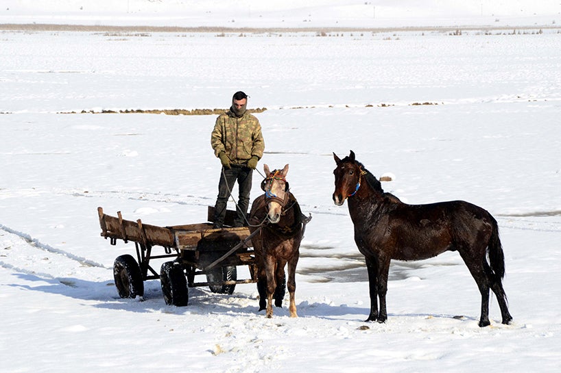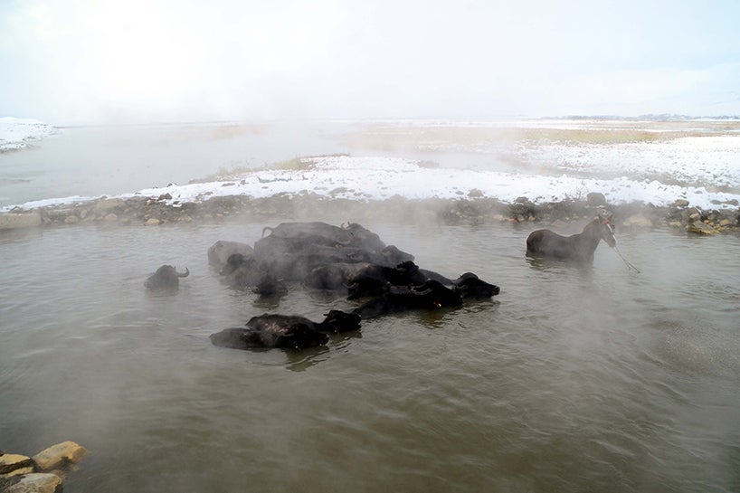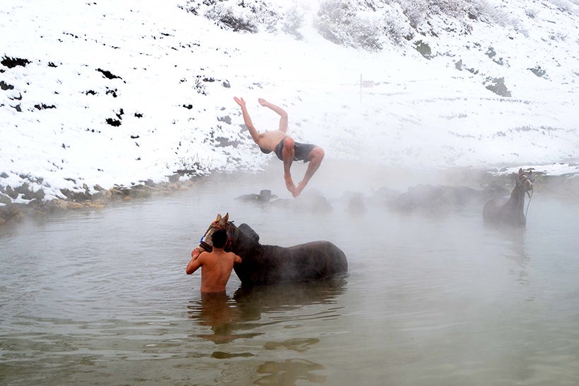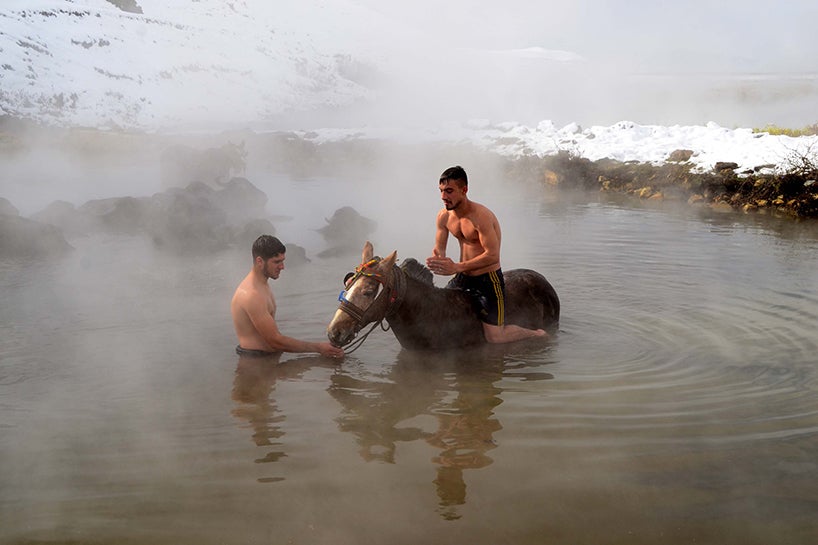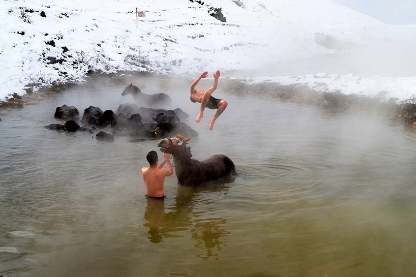 At ve mandaların sırtına çıkarak takla atan gençler, dondurucu soğukta kaplıcada yüzmenin de keyfini yaşıyor.