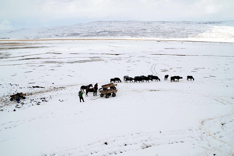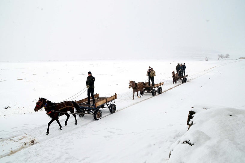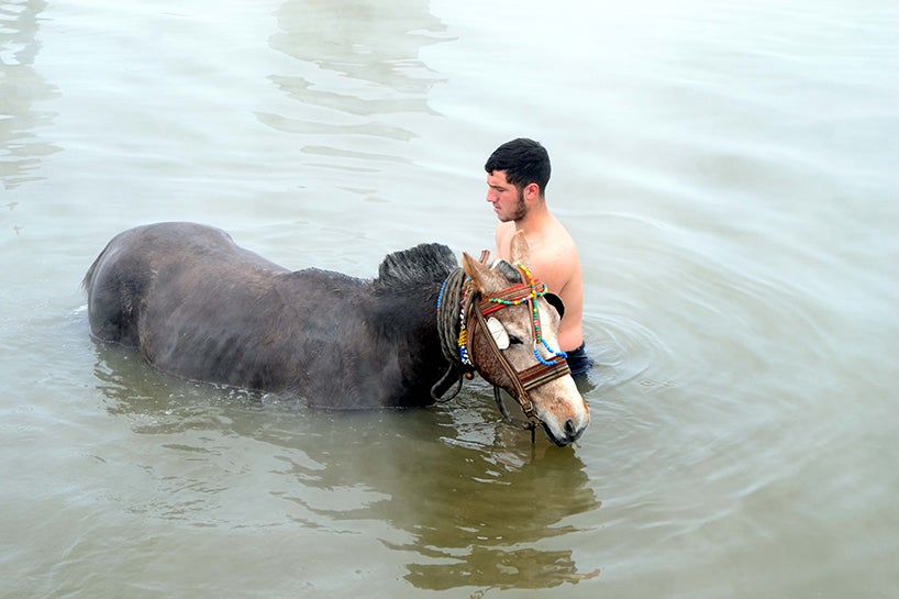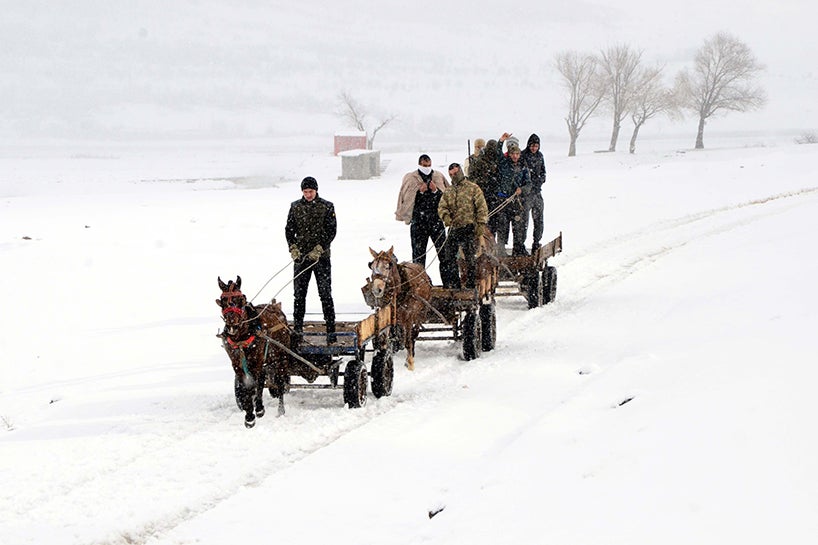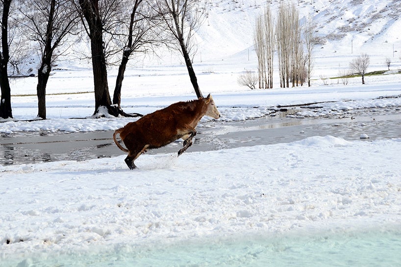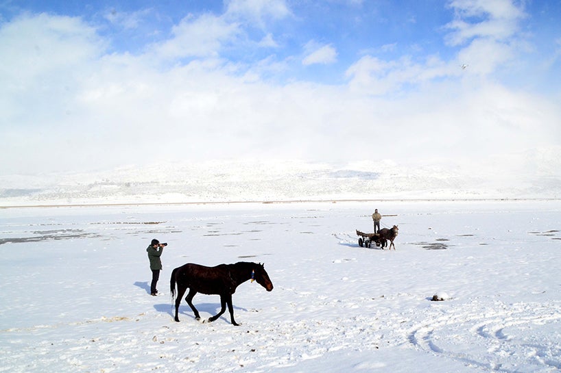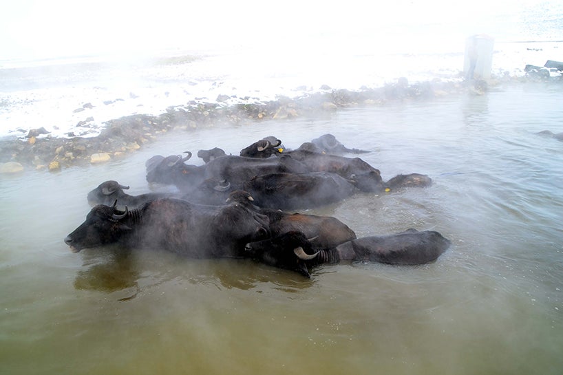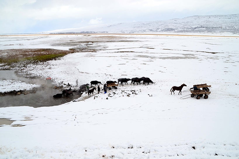 At ve mandaların sırtına çıkarak takla atan gençler, dondurucu soğukta kaplıcada yüzmenin de keyfini yaşıyor.