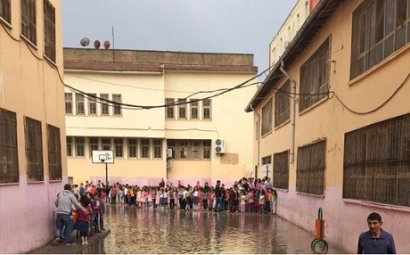 İtfaiye ekipleri küçük öğrencileri kucağına alarak okul bahçesinden dışarıya çıkardı ve suyu vidanjörlerle tahliye etmeye çalıştı.