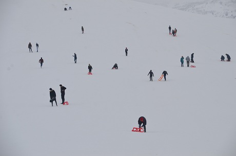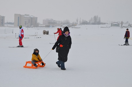 Kent merkezine 8 kilometre uzaktaki 2 bin 300 rakımlı Güzeltepe Dağı'nın zirvesindeki merkeze gelen kayak severler, bin 300 metre uzunluğundaki pistlerde kayak yaptı. Çocuklar da kızaklarla kayarak eğlendi.