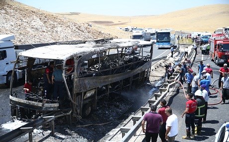 Bodrum'dan Mardin'e giden sürücüsünün adı henüz belirlenemeyen 47 KJ 267 plakalı yolcu otobüsü, Urfa - Mardin karayolunun 42. kilometresindeki Çobanderesi mevkisinde lastiğinin patlaması sonucu bariyerlere çarparak alev aldı.