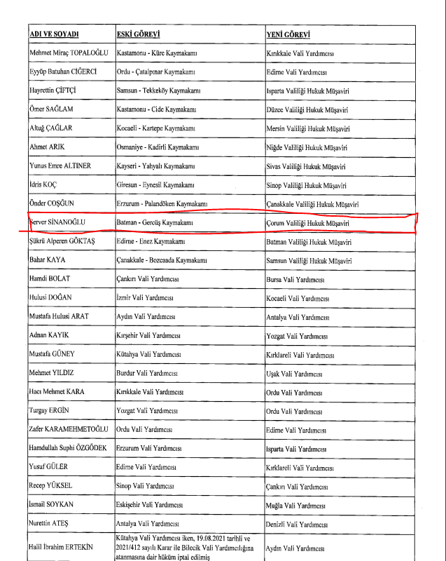Yayımlanan kararnamede Bismil'de devlete ait resmi aracı alkollü kullanırken 13 yaşındaki Muhammet Çelik'e çarpıp ölümüne neden olan ve tutuklu bulunan Gercüş Kaymakamı Server Sinanoğlu, Çorum Valiliği Hukuk Müşavirliğine atandı.