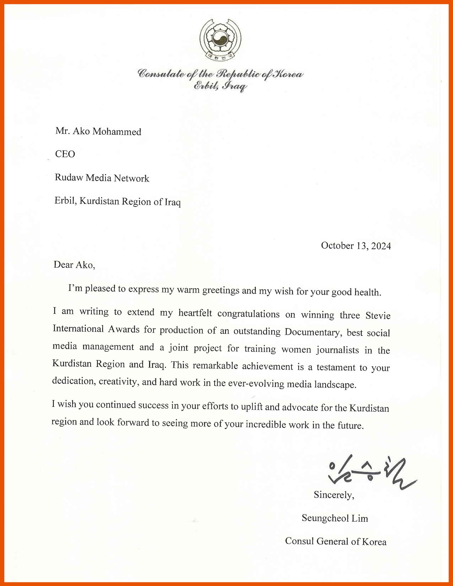 Güney Kore’nin Erbil Başkonsolosu Seungcheol Lim, ödüller nedeniyle Rûdaw Medya Grubu Genel Müdürü Ako Muhammed’e tebrik mesajı gönderdi.