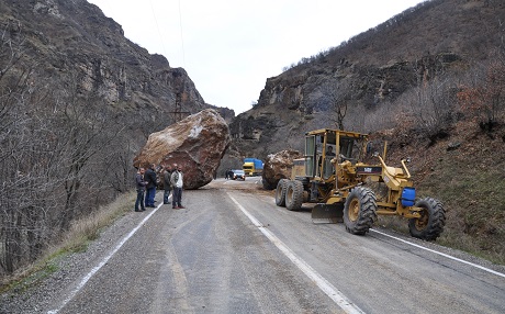 Haber Merkezi – Bugün Dersim-Pülümür-Erzincan karayoluna 40. kilometrede bulunan Dokuzkaya köyü mevkiinde dağdan kopan kayalar, yolu trafiğe kapattı.