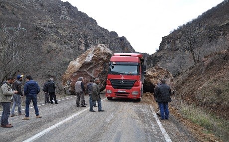 Dersim-Pülümür-Erzincan karayoluna bugün öğleden sonra dağdan kopan yüzlerce tonluk 2 kaya düştü. Düşen kayalar nedeniyle karayolunda ulaşımda problem yaşandı. Ağır tonajlı araçların yoldaki bekleyişleri ise sürüyor. Kaya düşmesi esnasında araç geçmemesi büyük bir faciayı önlemiş oldu.