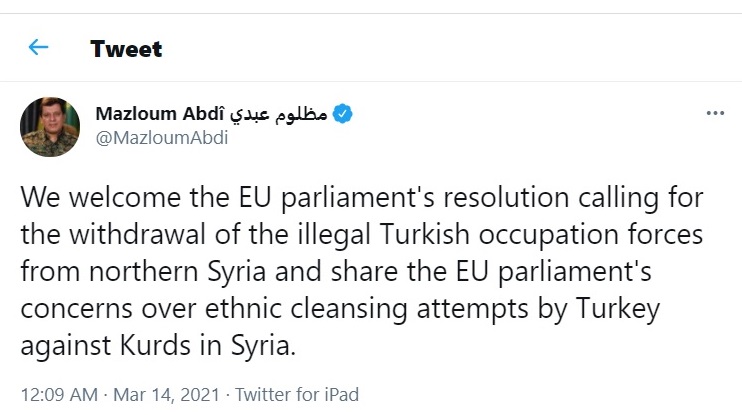 Abdi, “AB Parlamentosu’nun Türkiye'nin Suriye'deki Kürtlere yönelik etnik temizlik girişimlerine ilişkin endişelerini paylaşıyoruz” ifadelerini kullandı.