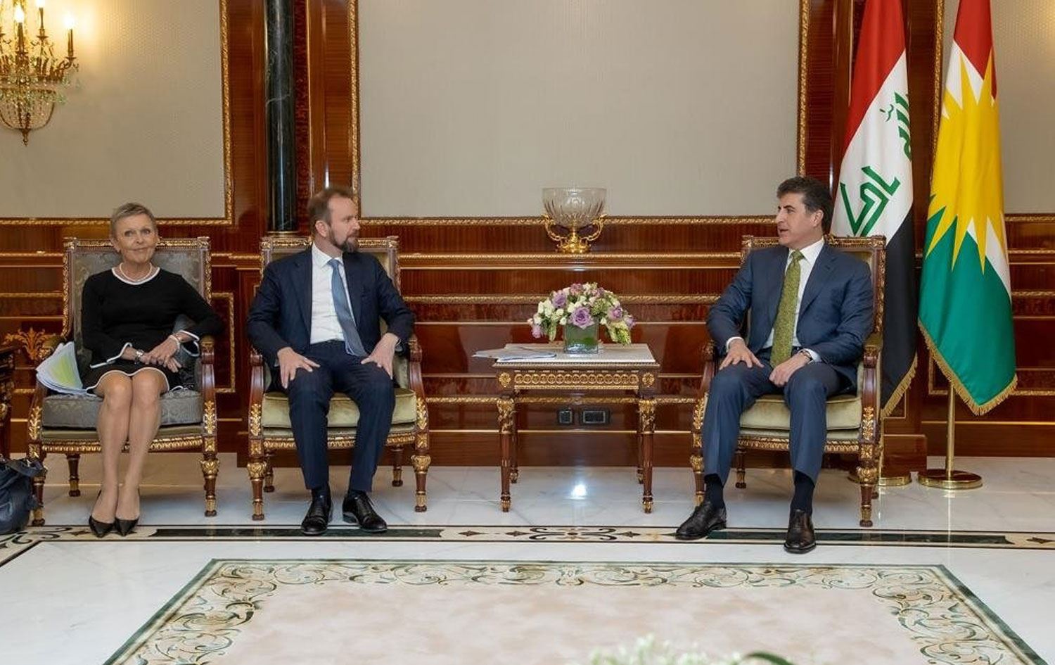 Erbil (Rûdaw) – Başkan Neçirvan Barzani, Avrupa Birliği’nin (AB) Irak Büyükelçisi Ville Varjola ve Avrupa Birliği Irak Danışma Misyonu Başkanı Anne Meskanen başkanlığındaki heyeti kabul etti.