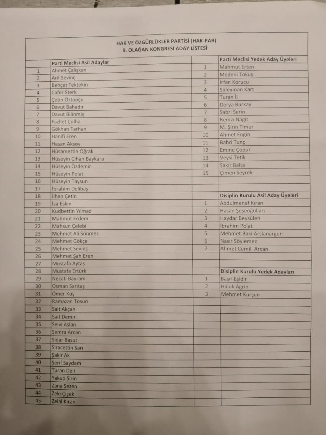 Haber Merkezi – Hak ve Özgürlükler Partisi (HAK-PAR) Ankara’da 9’uncu Olağan Kongresi’ni gerçekleştirdi. Kongrede Düzgün Kaplan partinin yeni genel başkanı seçildi.
