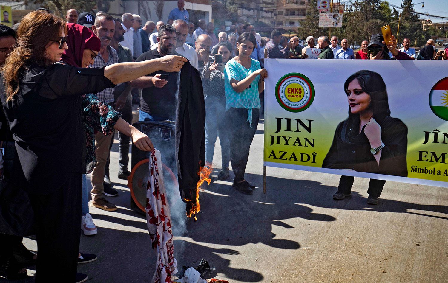 Rojava'nın Kamışlo kentinde, Jîna Mahsa Emini'nin (pankart) ölümü nedeniyle Suriye Kürt Ulusal Konseyi tarafından bugün düzenlenen dayanışma protestosu sırasında başörtüleri yakıldı. / Foto: Delil Souleiman / AFP