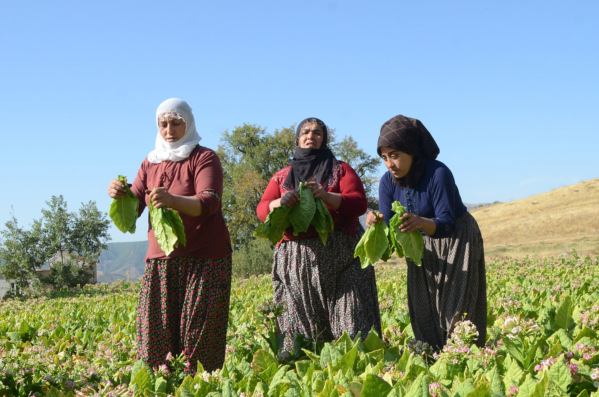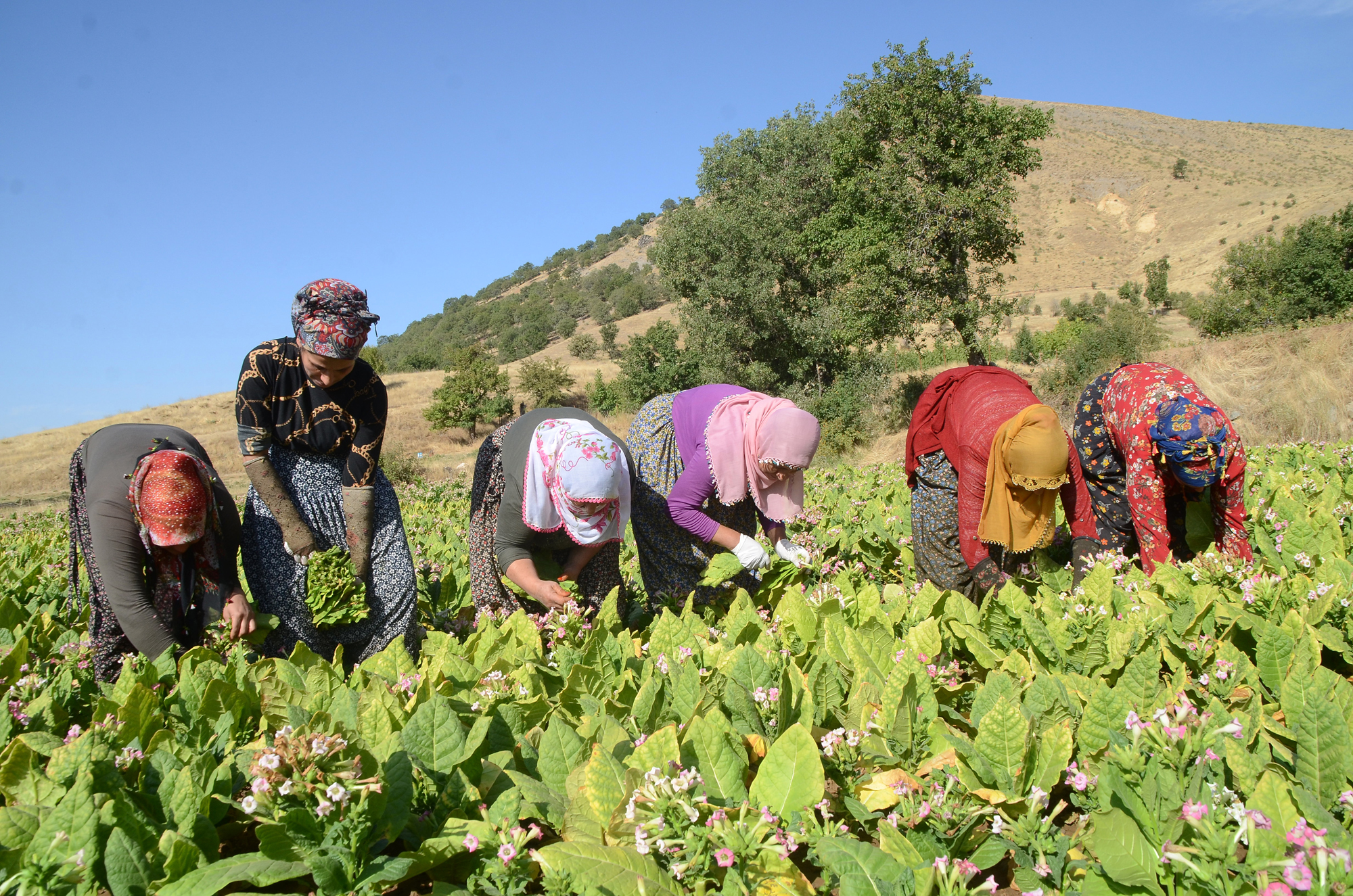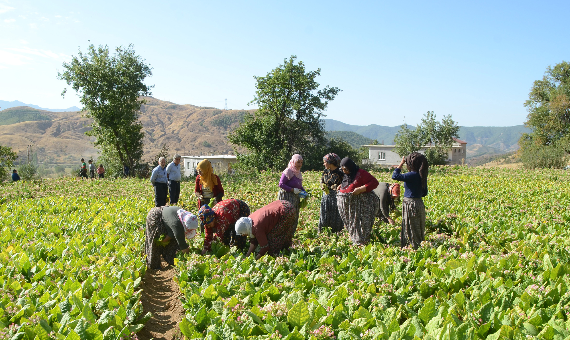 Yaklaşık 5 ay boyunca her gün sulanan ve özenle bakımı yapılan tütün, kadınlar tarafından imece usulüyle toplanıyor.