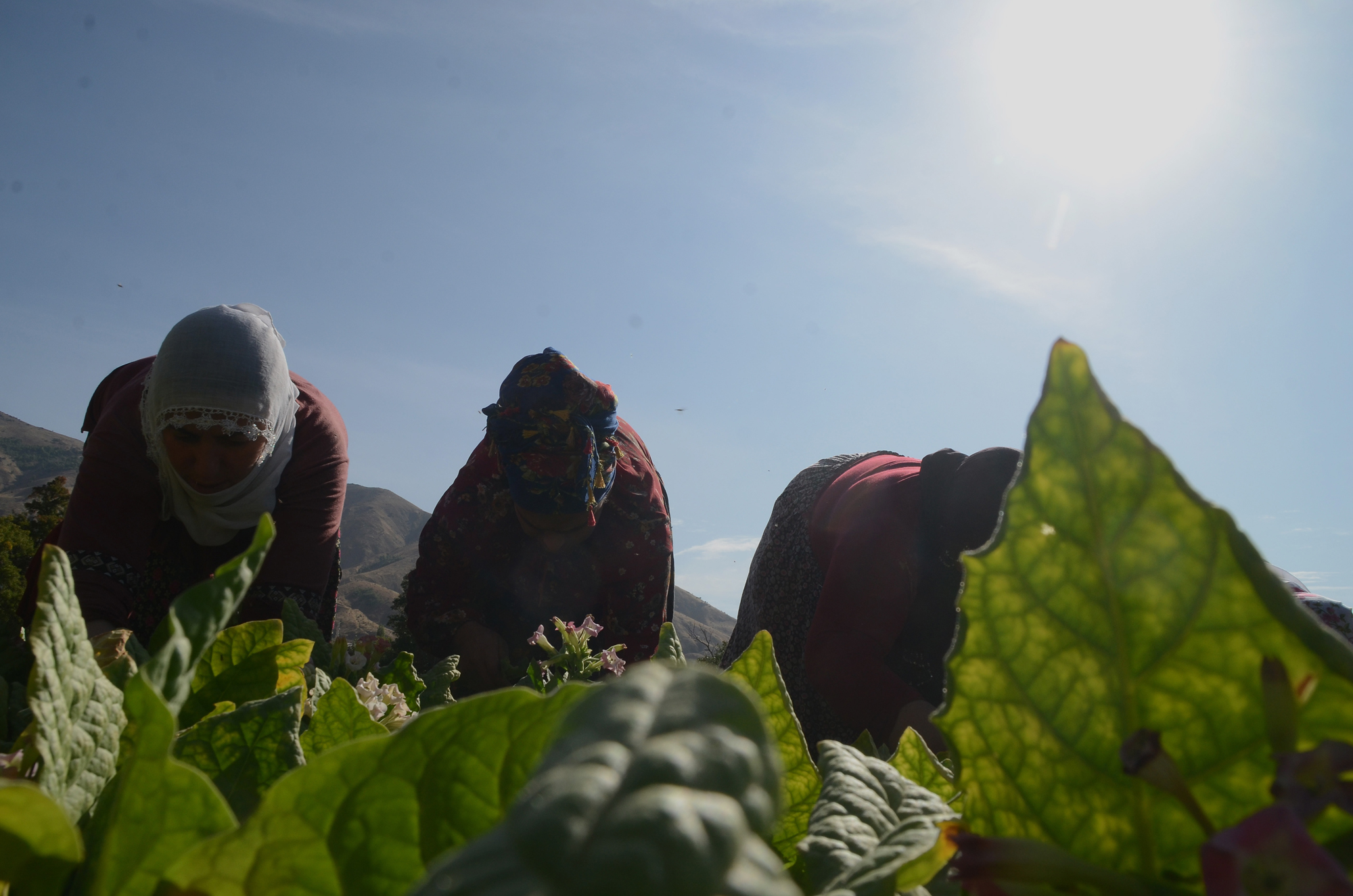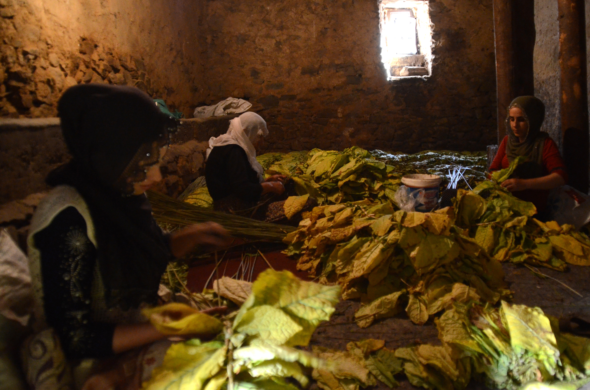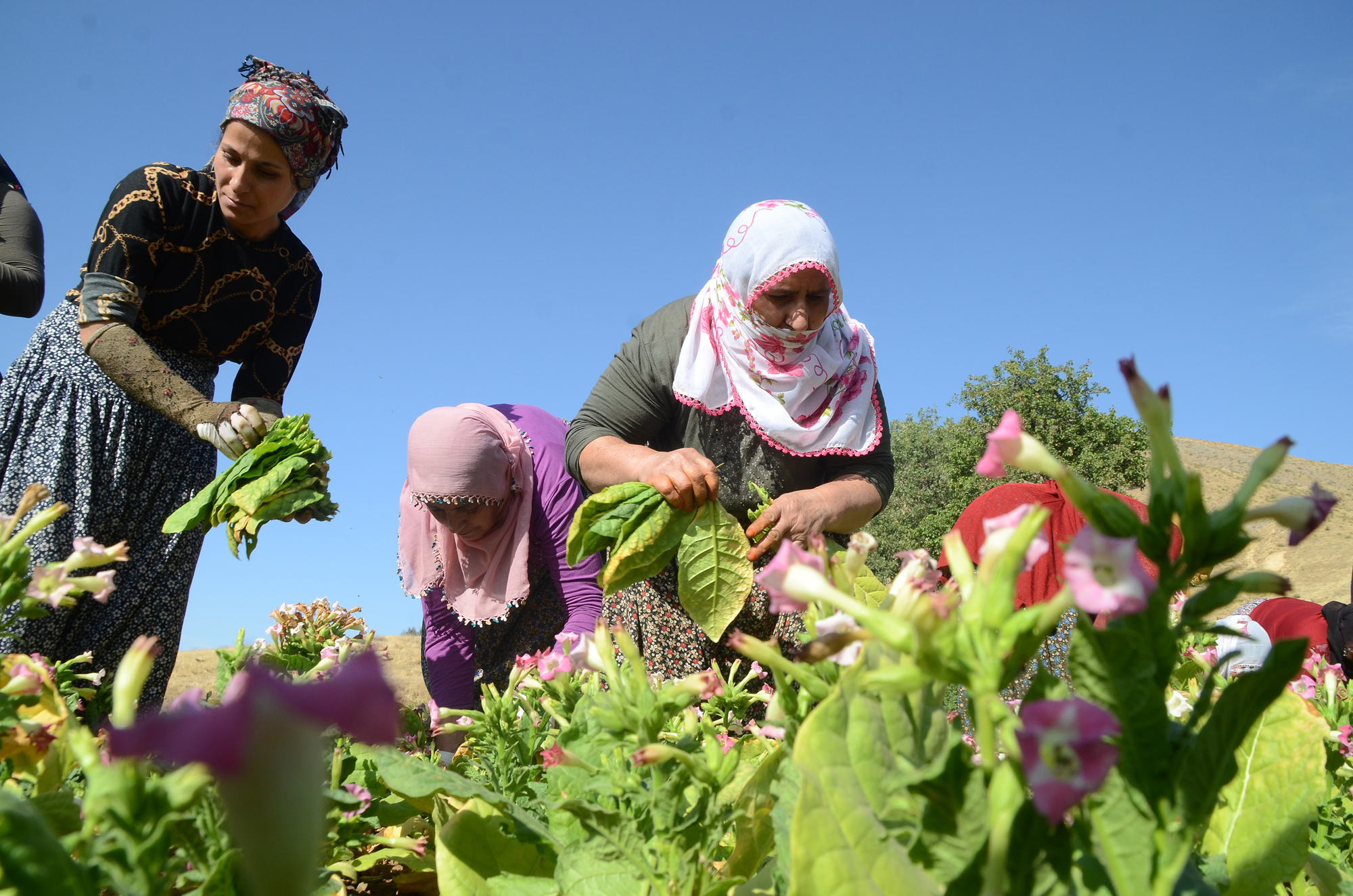 Yaklaşık 5 ay boyunca her gün sulanan ve özenle bakımı yapılan tütün, kadınlar tarafından imece usulüyle toplanıyor.