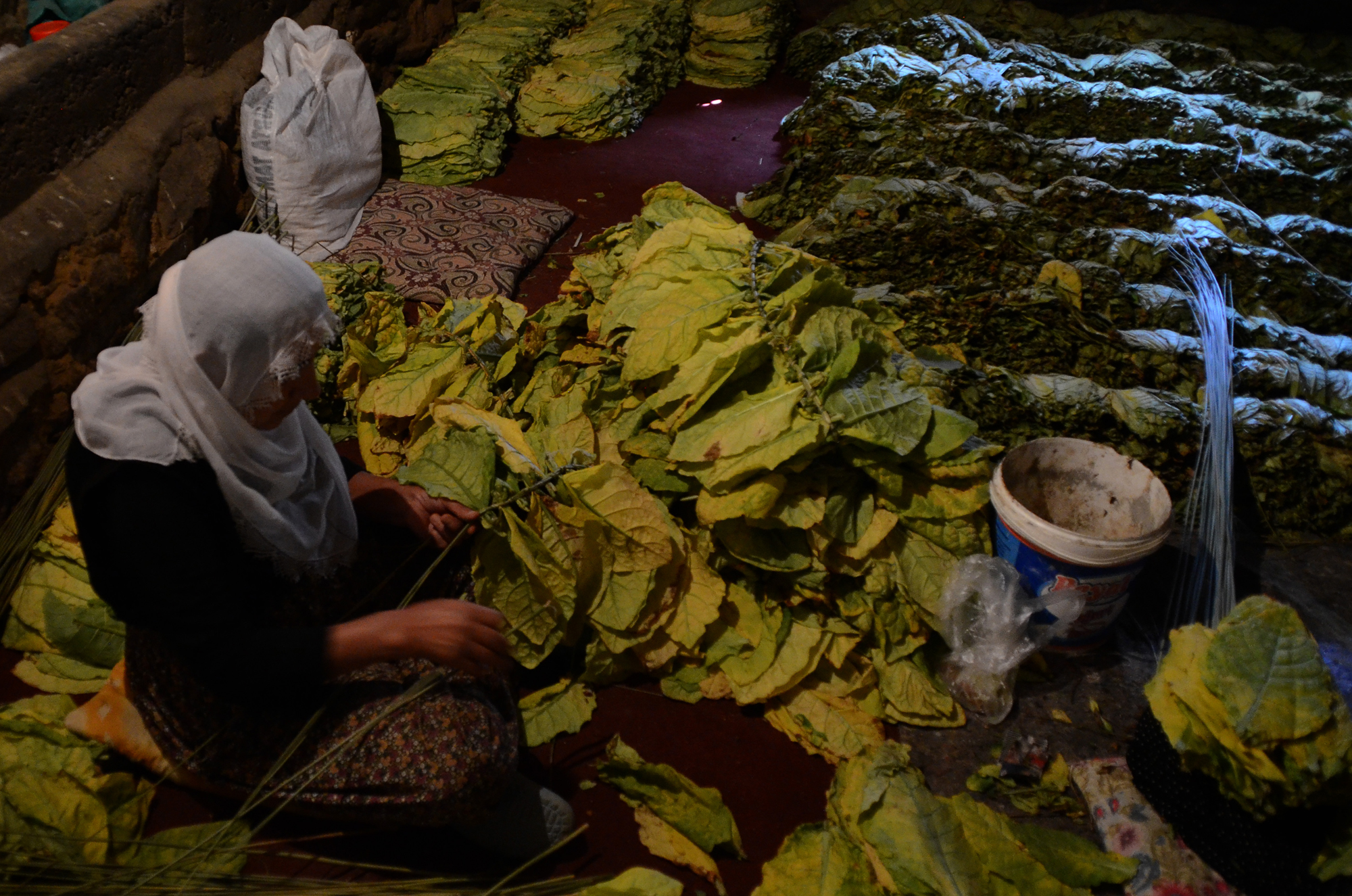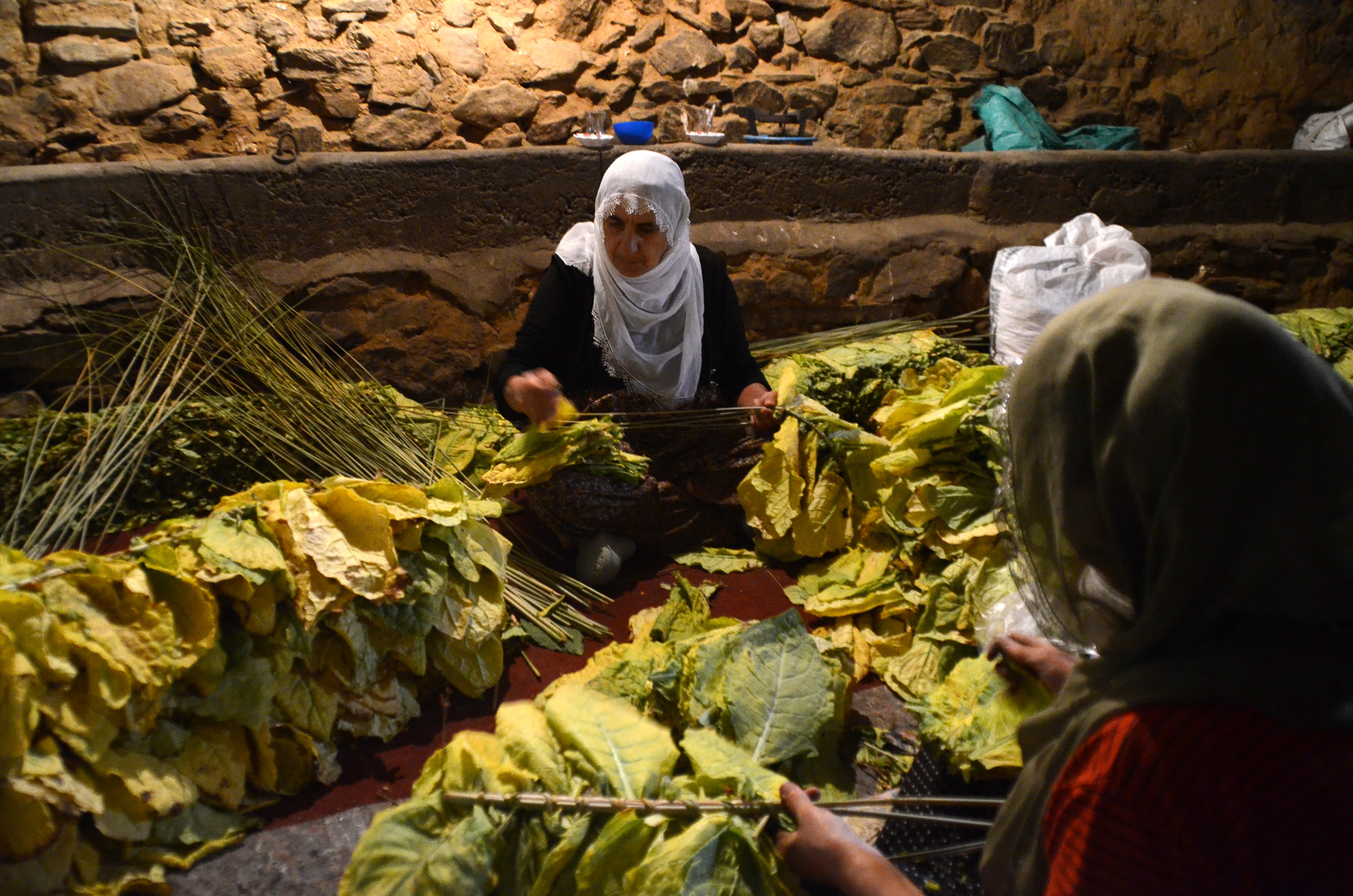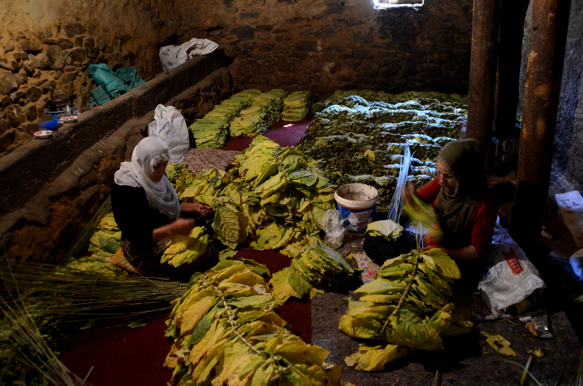 Daha sonra "patpat" olarak tabir edilen tarım araçlarıyla tütünleri köye taşıyan kadınlar, sararan yaprakları sazlık ve bataklık alanlardan topladıkları kamışlara dizerek kurumaya bırakıyor.