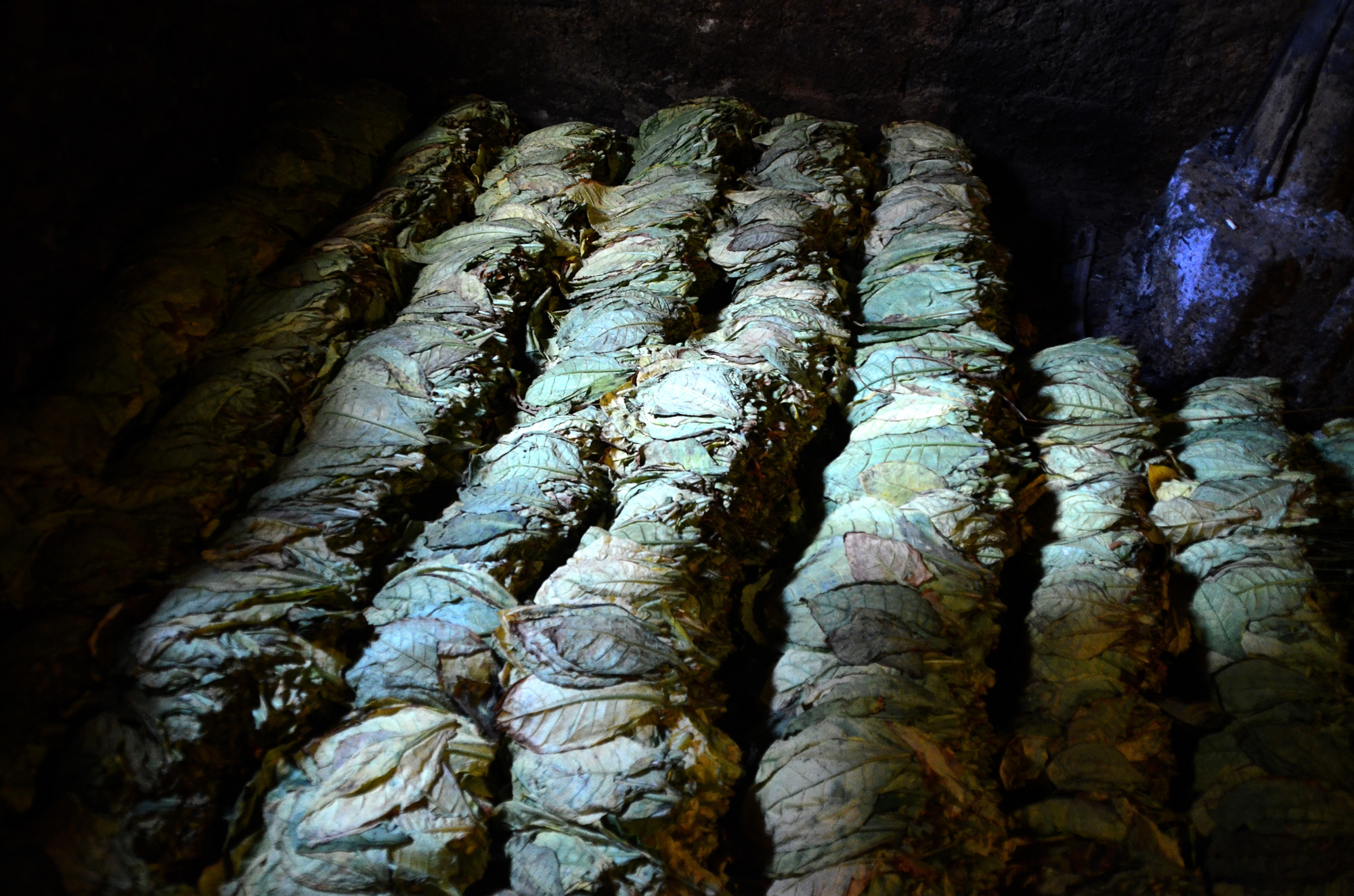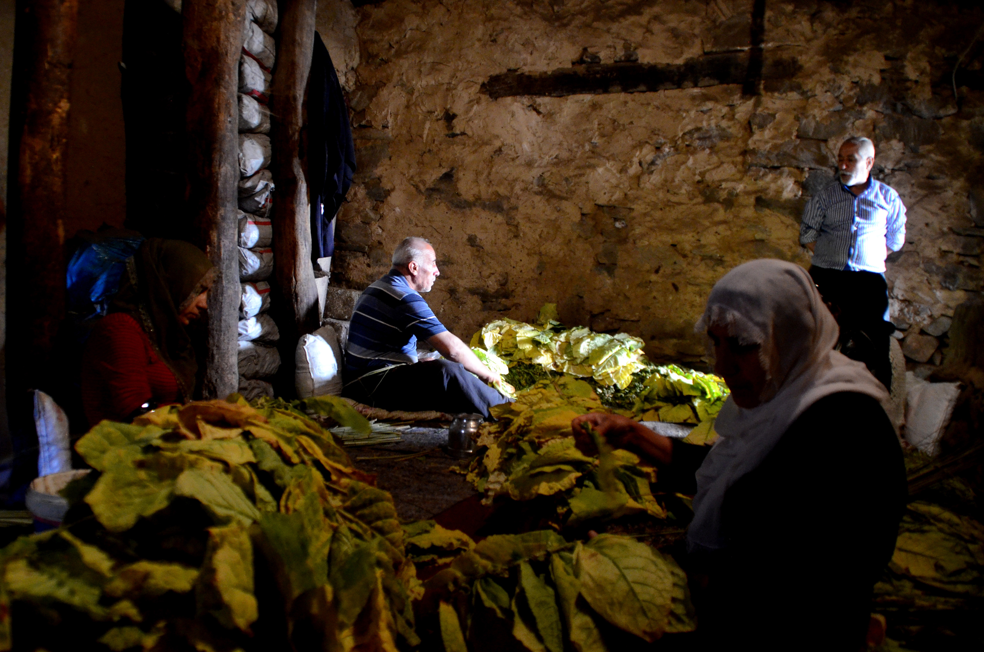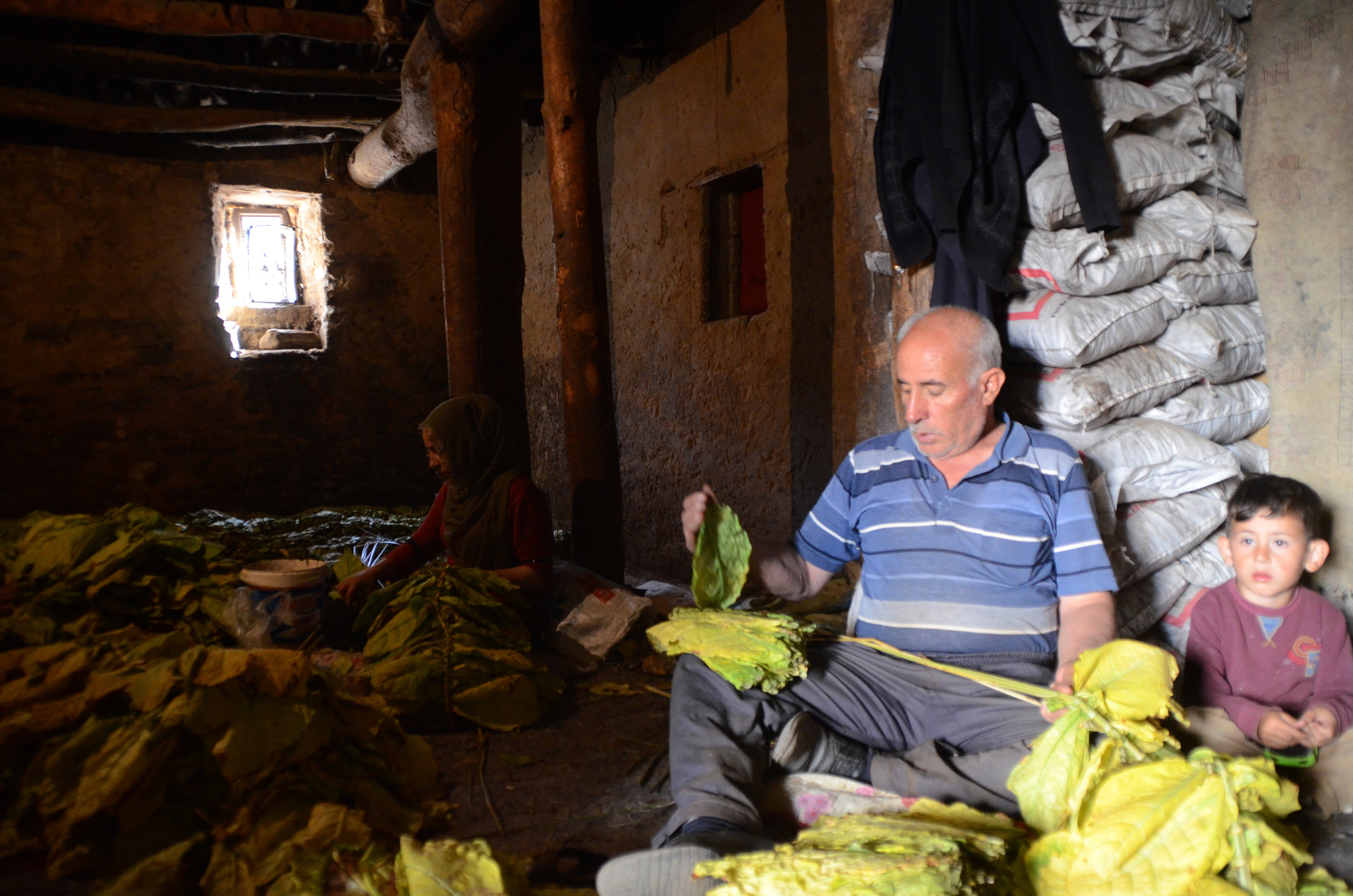 Daha sonra "patpat" olarak tabir edilen tarım araçlarıyla tütünleri köye taşıyan kadınlar, sararan yaprakları sazlık ve bataklık alanlardan topladıkları kamışlara dizerek kurumaya bırakıyor.