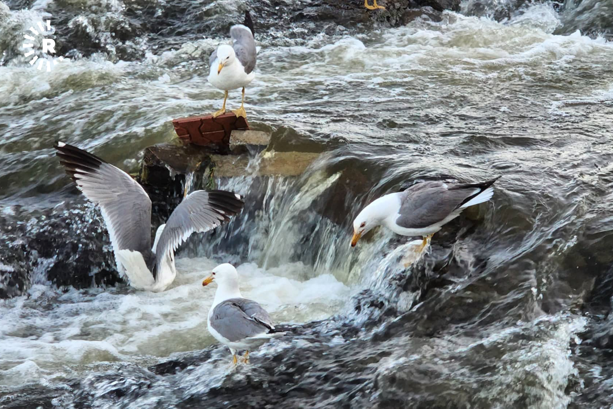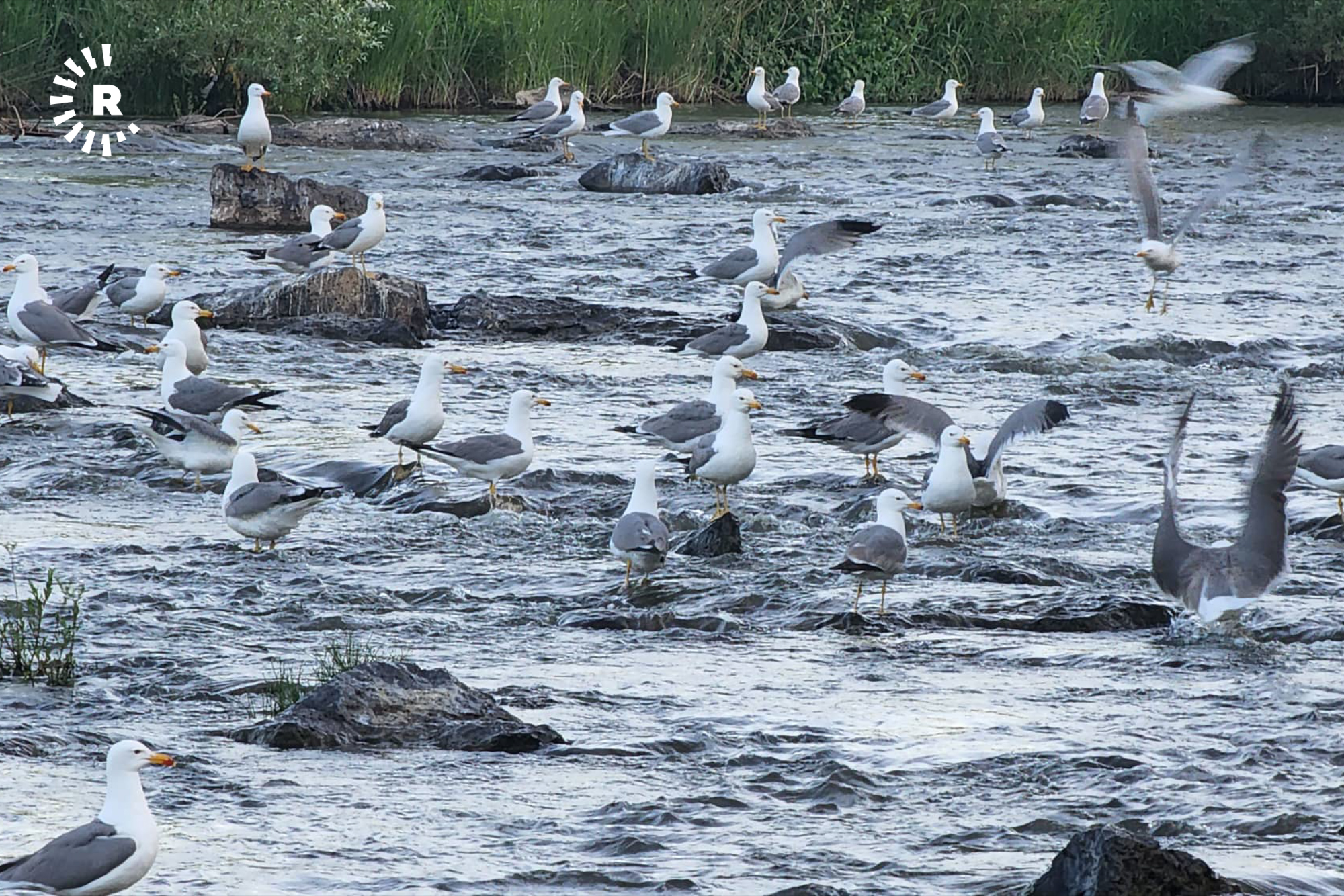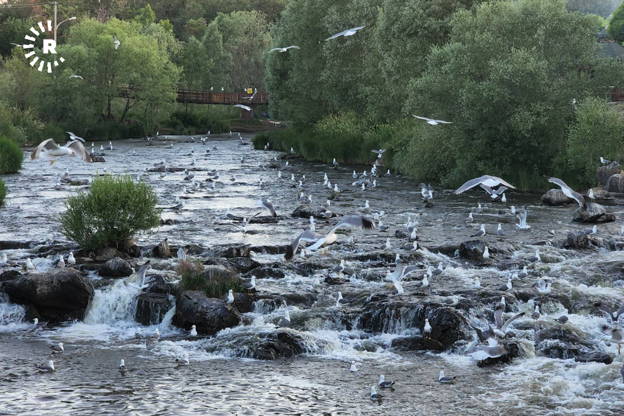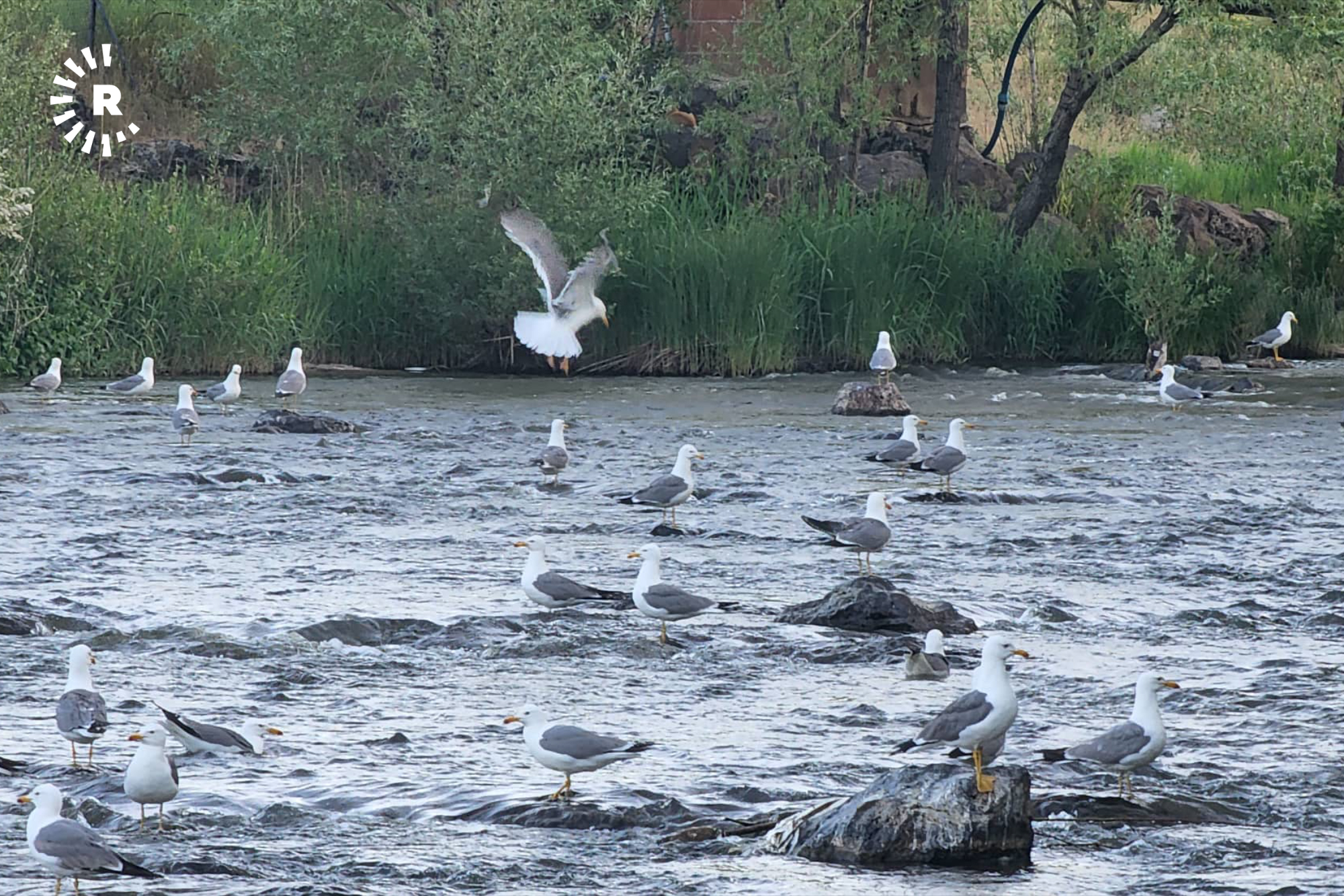 Erciş ilçesinde Çemê Payê’nin (Deli Çay) aktığı balık bendinde, martılar da göçü fırsat bilip balık avlıyor.
