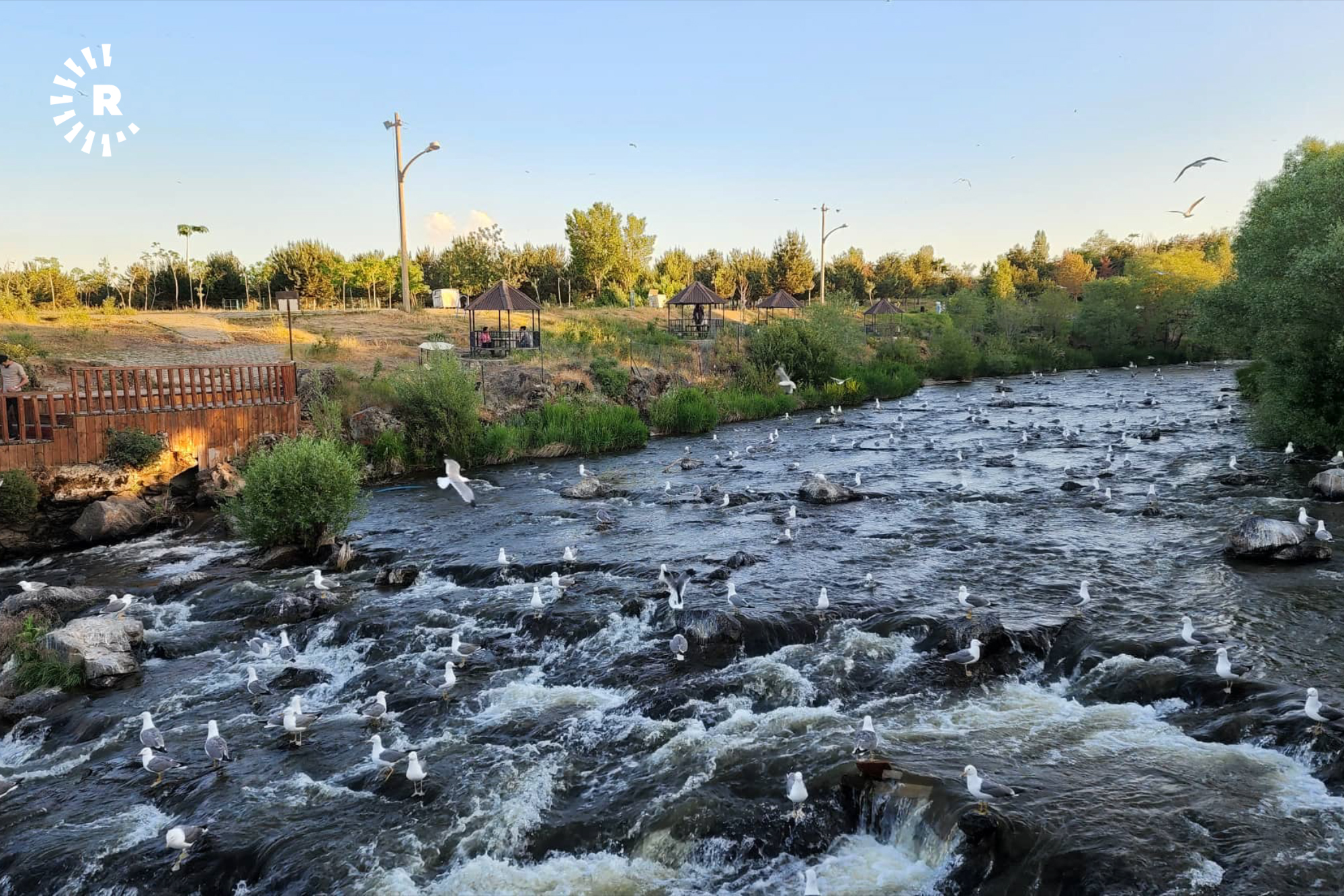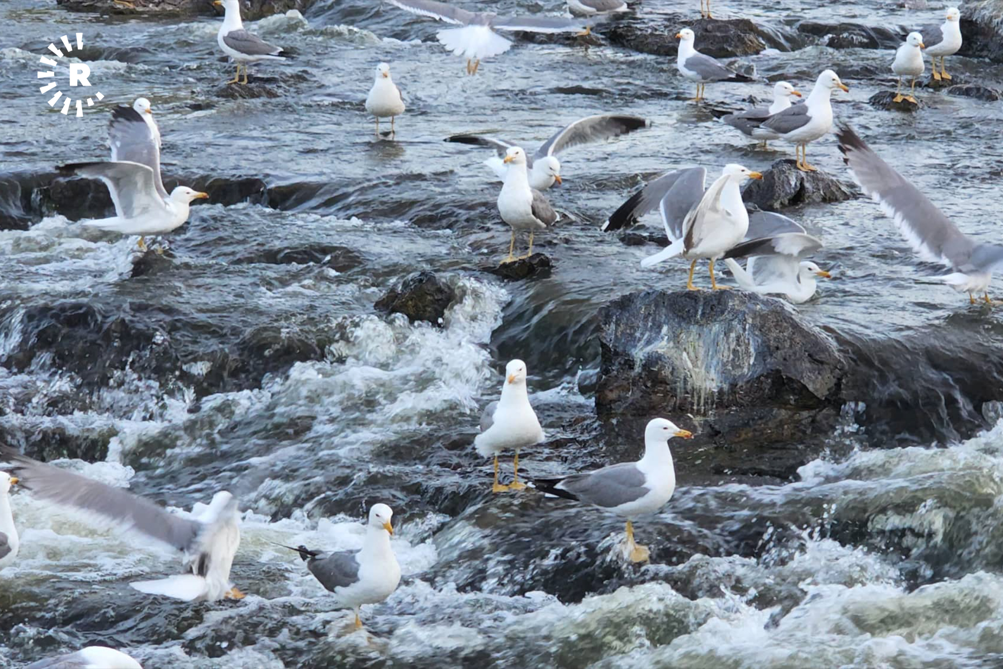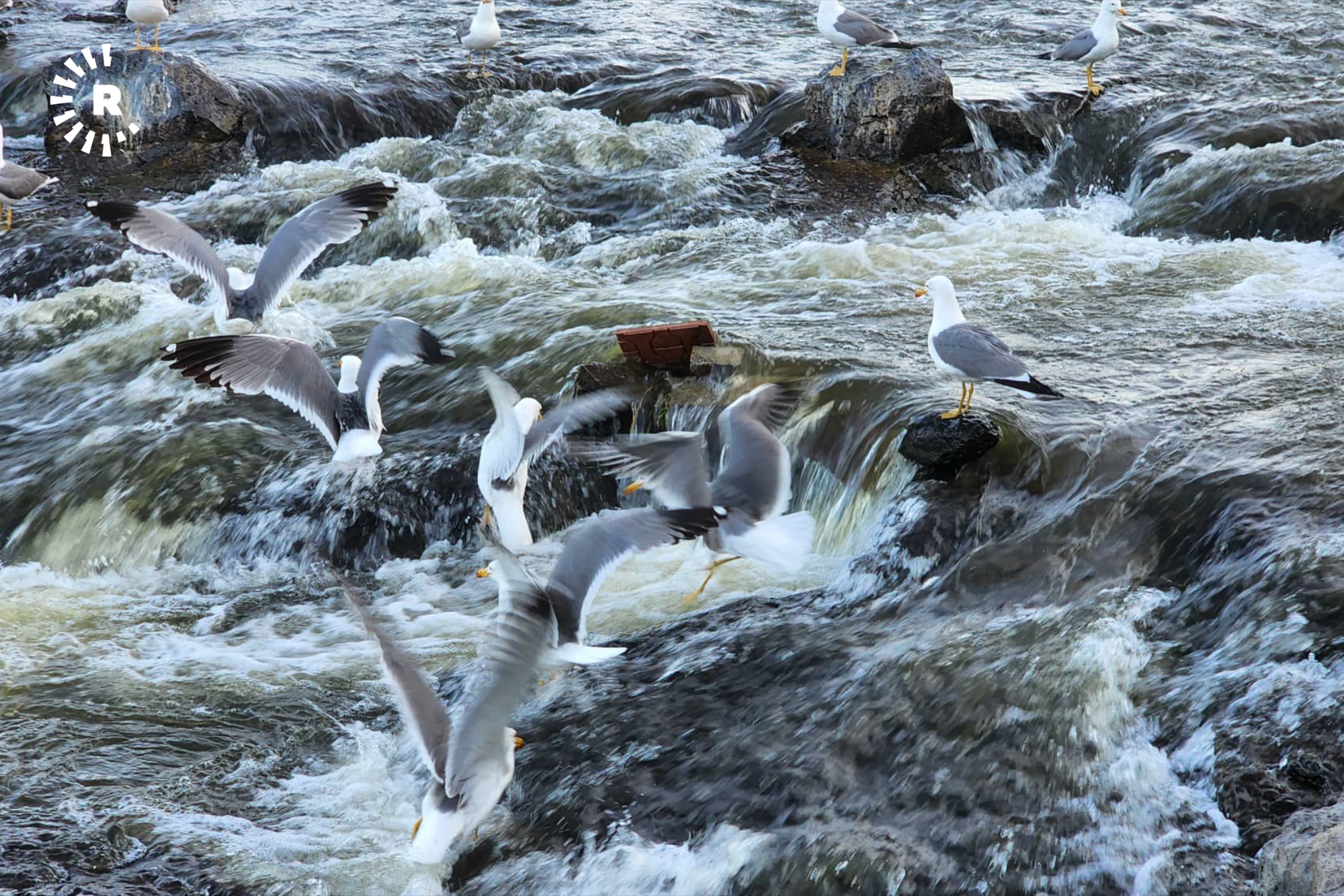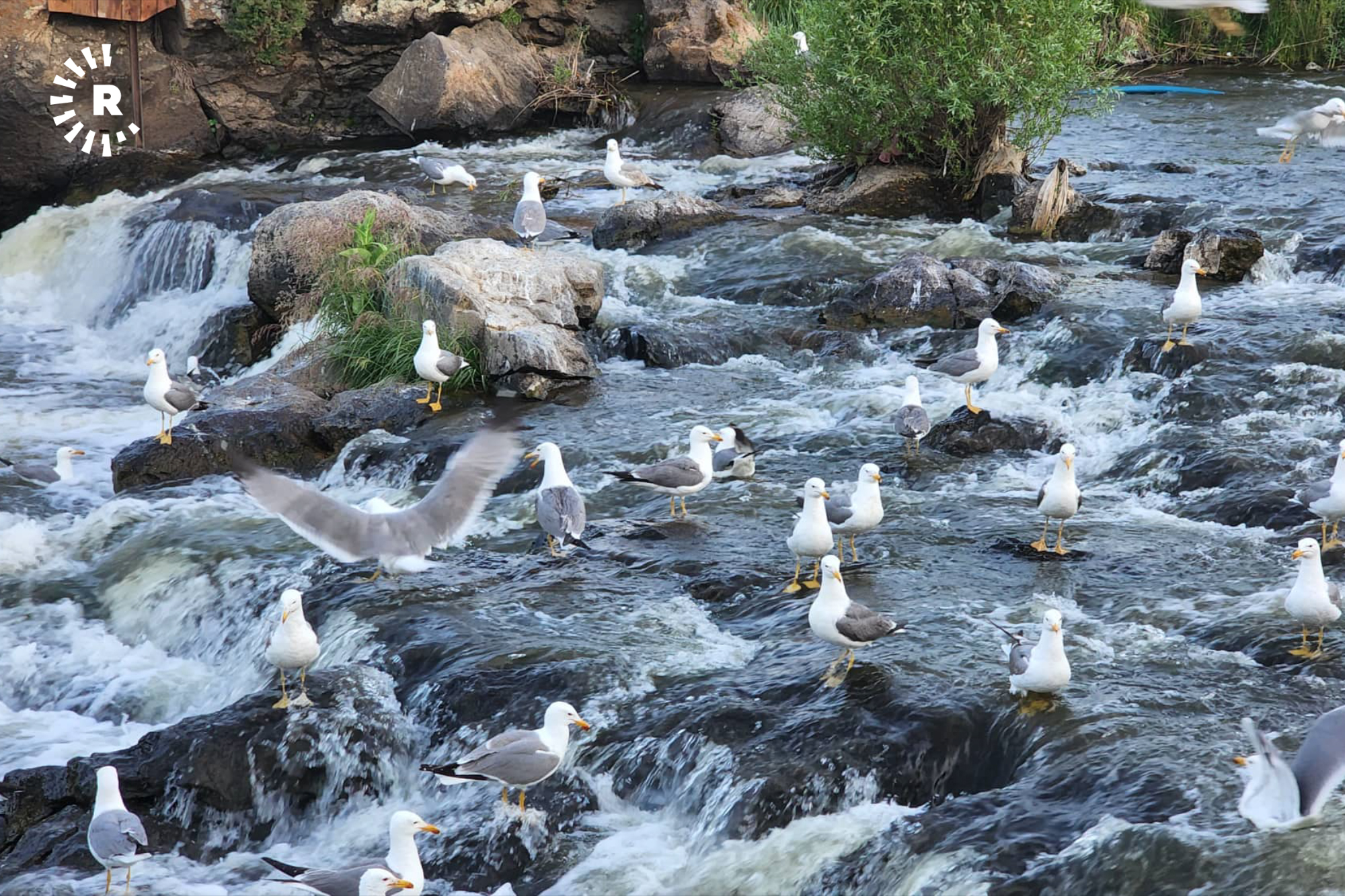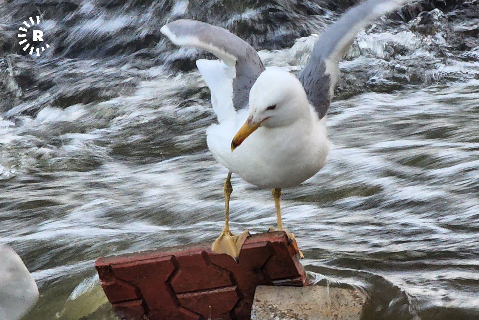 Erciş ilçesinde Çemê Payê’nin (Deli Çay) aktığı balık bendinde, martılar da göçü fırsat bilip balık avlıyor.