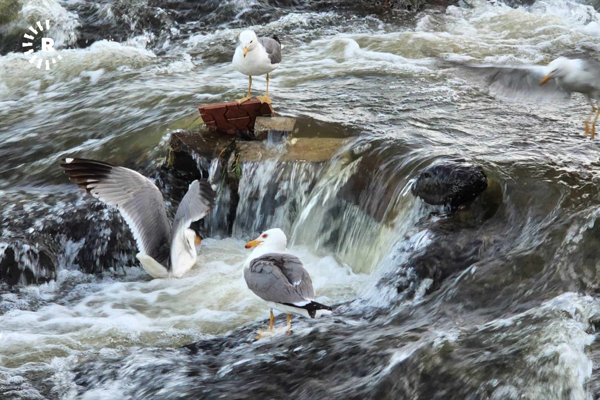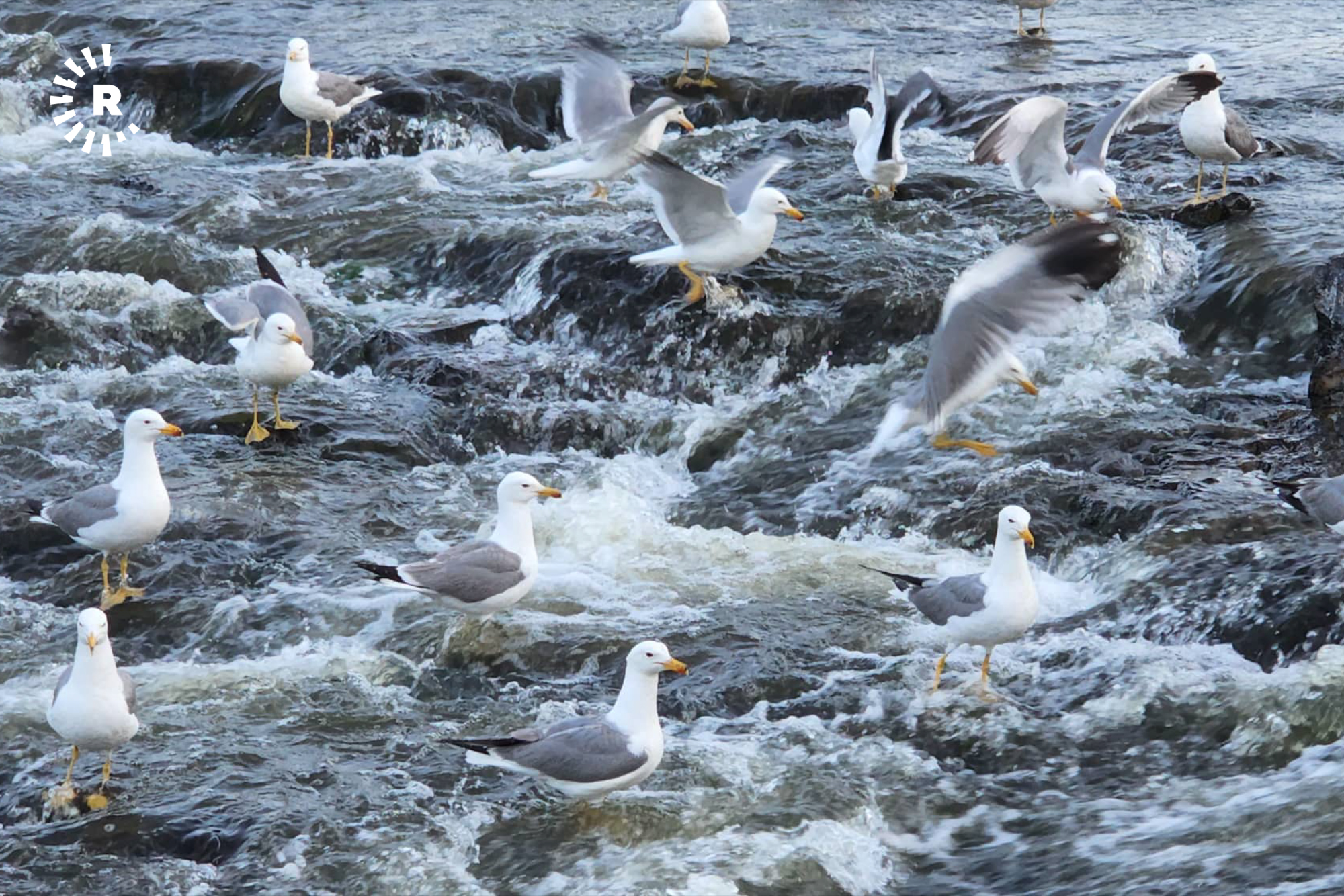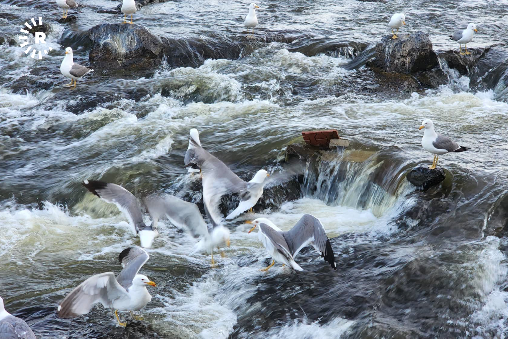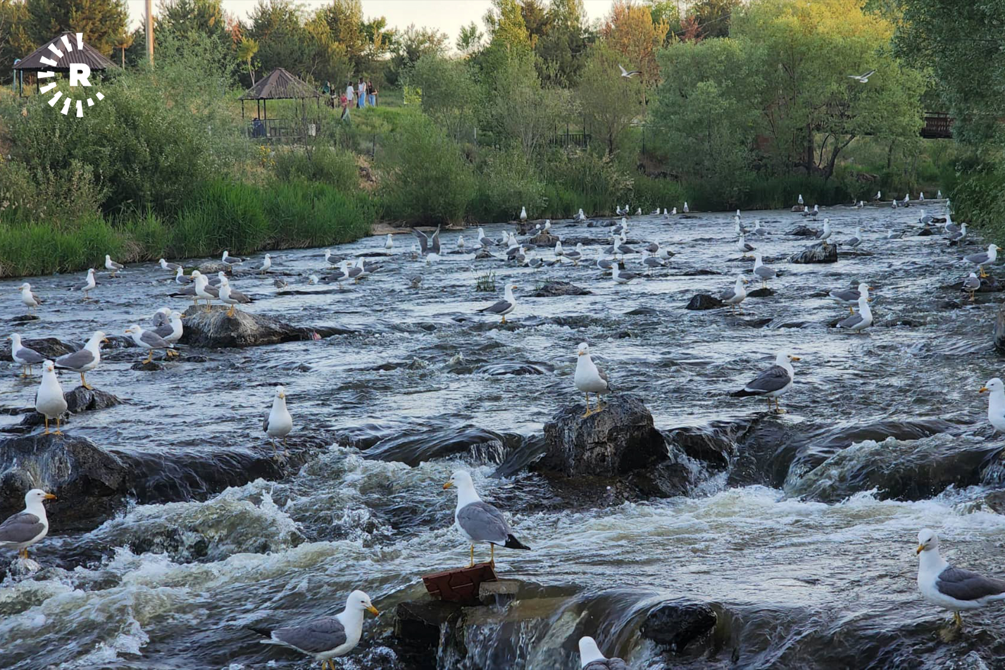 Erciş ilçesinde Çemê Payê’nin (Deli Çay) aktığı balık bendinde, martılar da göçü fırsat bilip balık avlıyor.