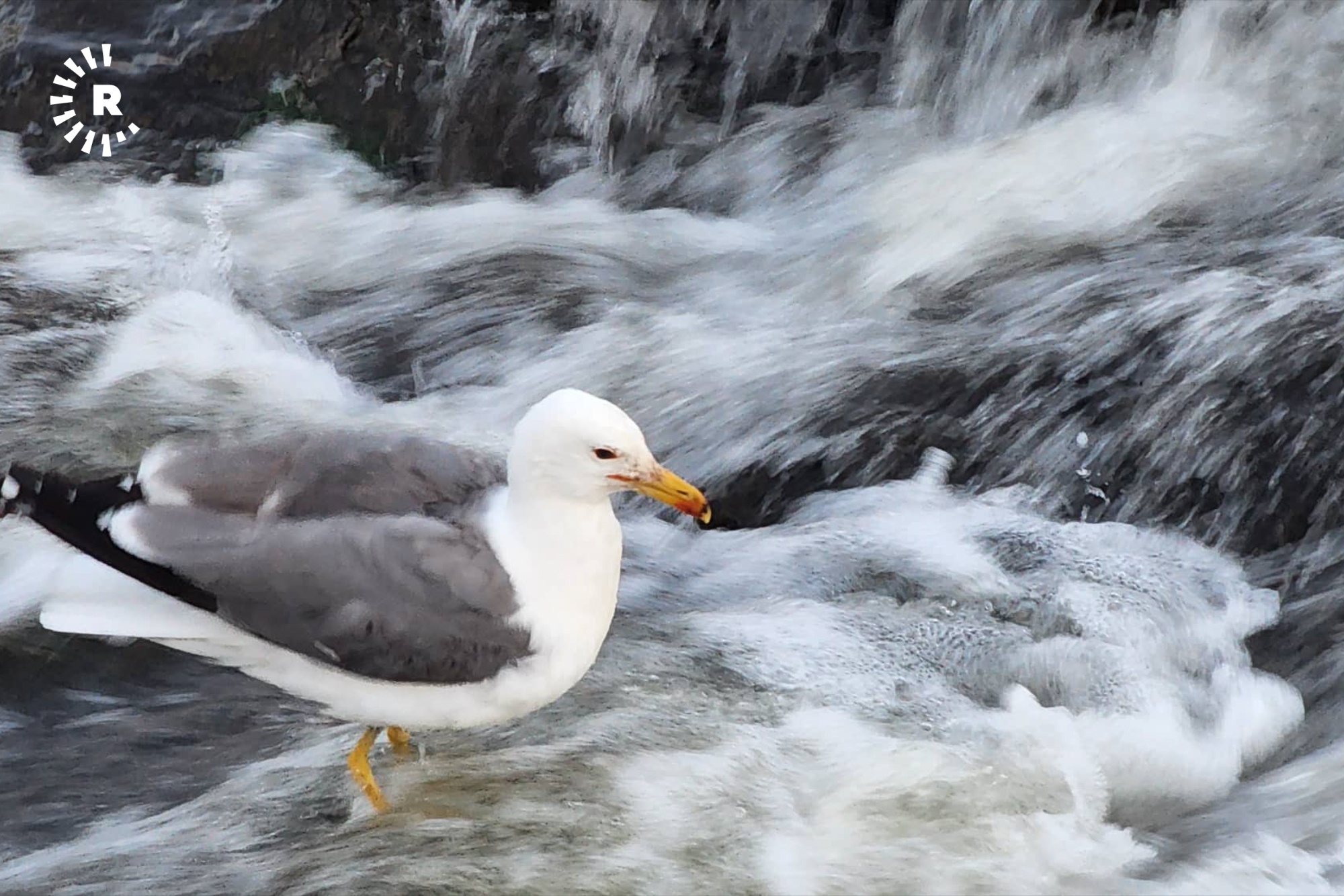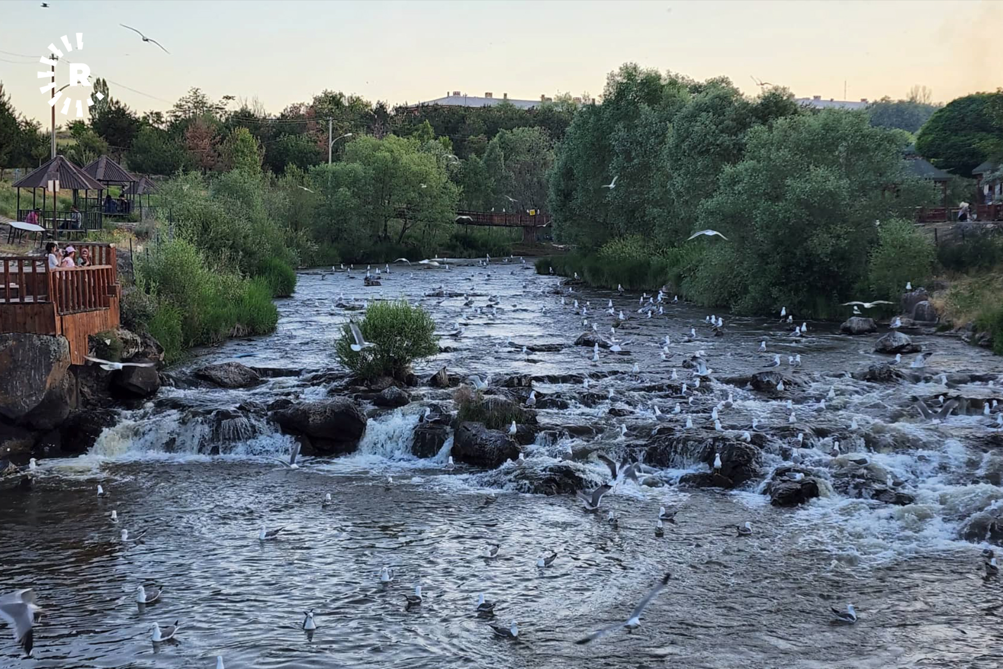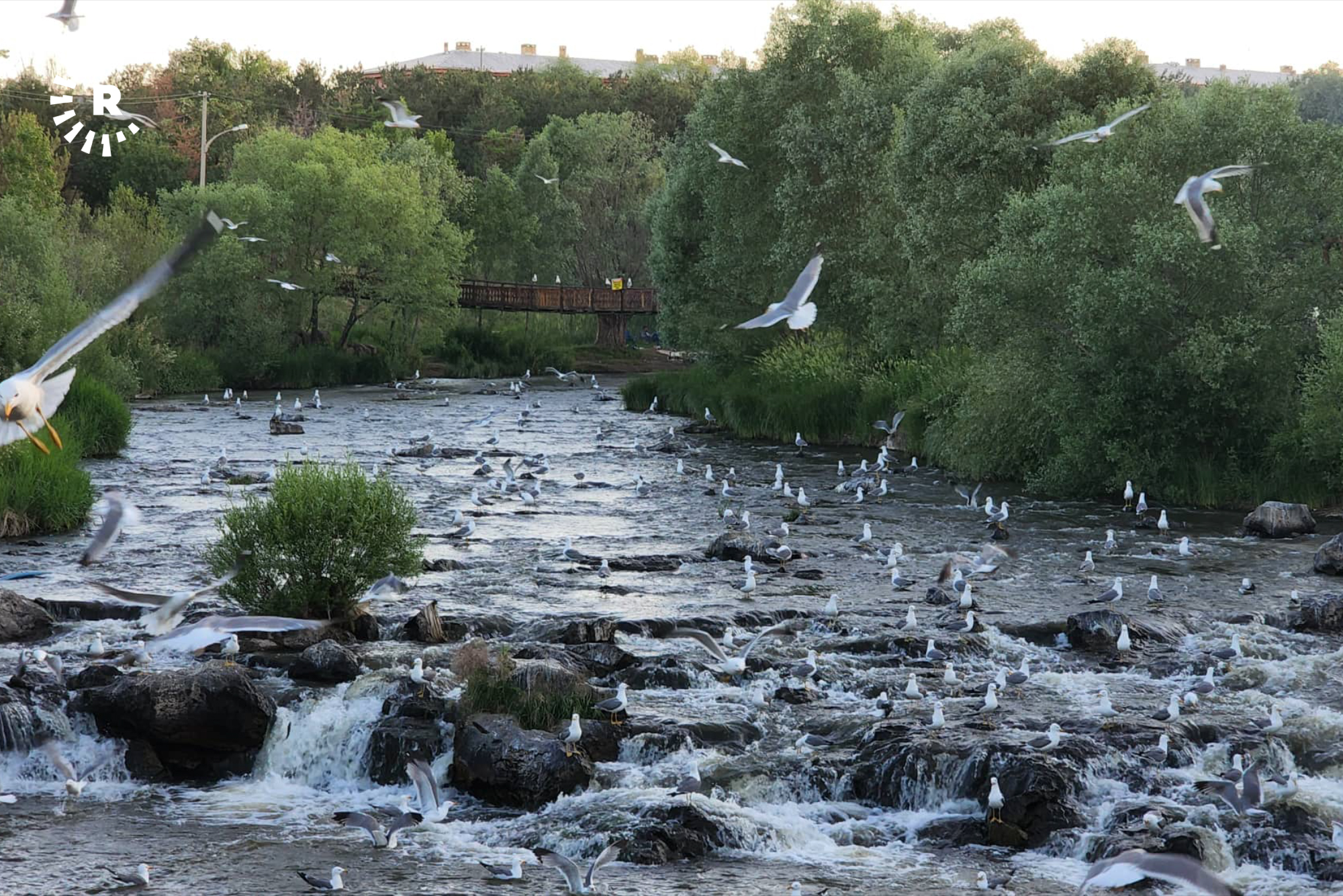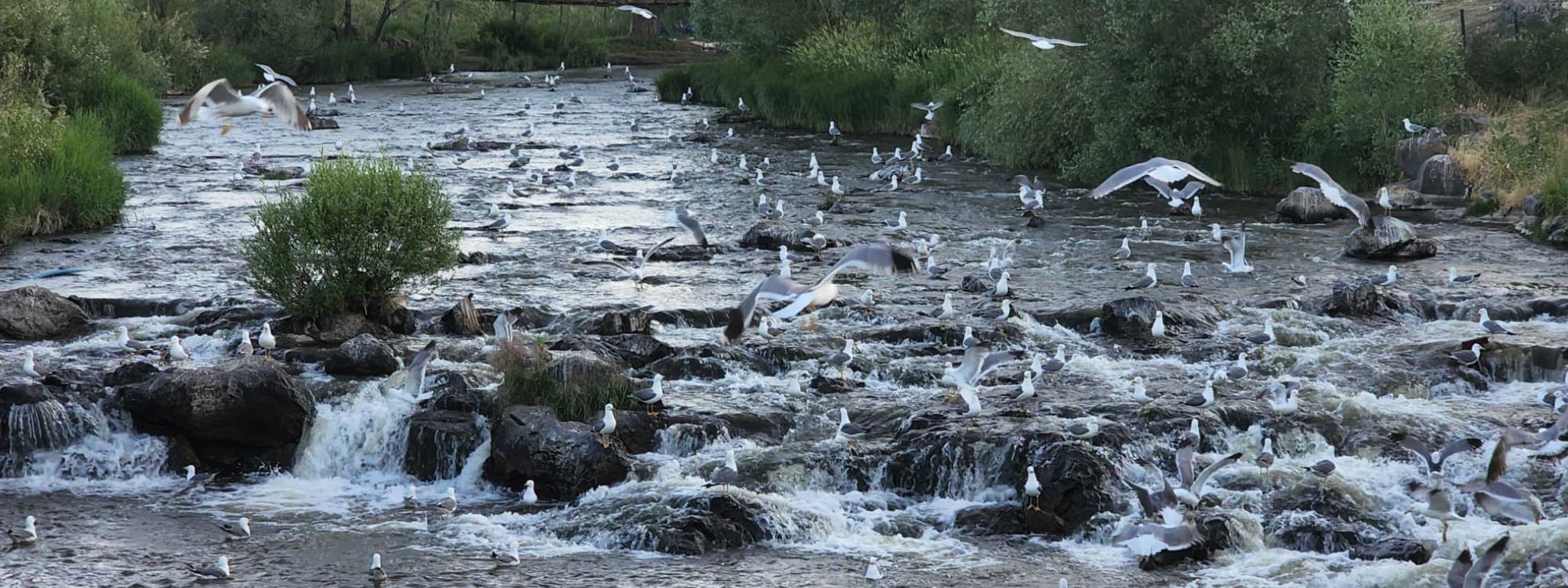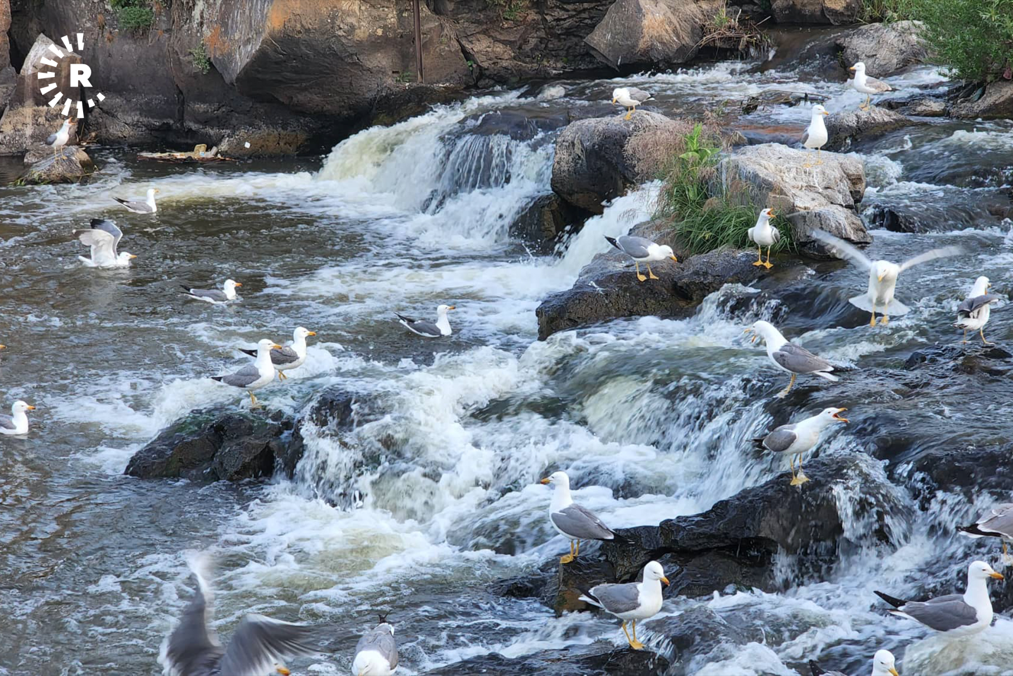 Erciş ilçesinde Çemê Payê’nin (Deli Çay) aktığı balık bendinde, martılar da göçü fırsat bilip balık avlıyor.