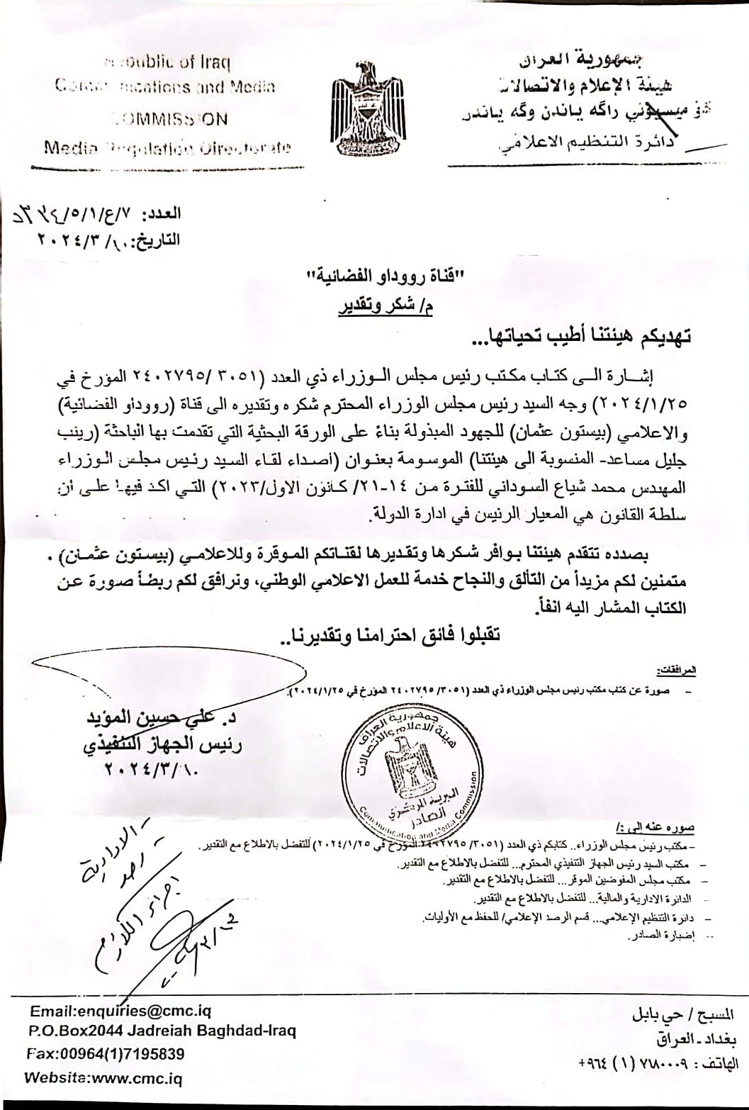Irak Medya ve İletişim Komisyonu Yürütme Ajansı Başkanı Ali Hüseyin, Irak Başbakanlığı'nın Irak Başbakanı Muhammed'in 24 Aralık 2024 tarihli 3051/2402795 numaralı mektubuna atıfta bulunarak Rudaw Medya Grubuna bir teşekkür mektubu gönderdi. Mektupta Irak Başbakanı es-Sudani, Rudaw Medya Grubu ve Bestun Osman'a şükranlarını iletti.