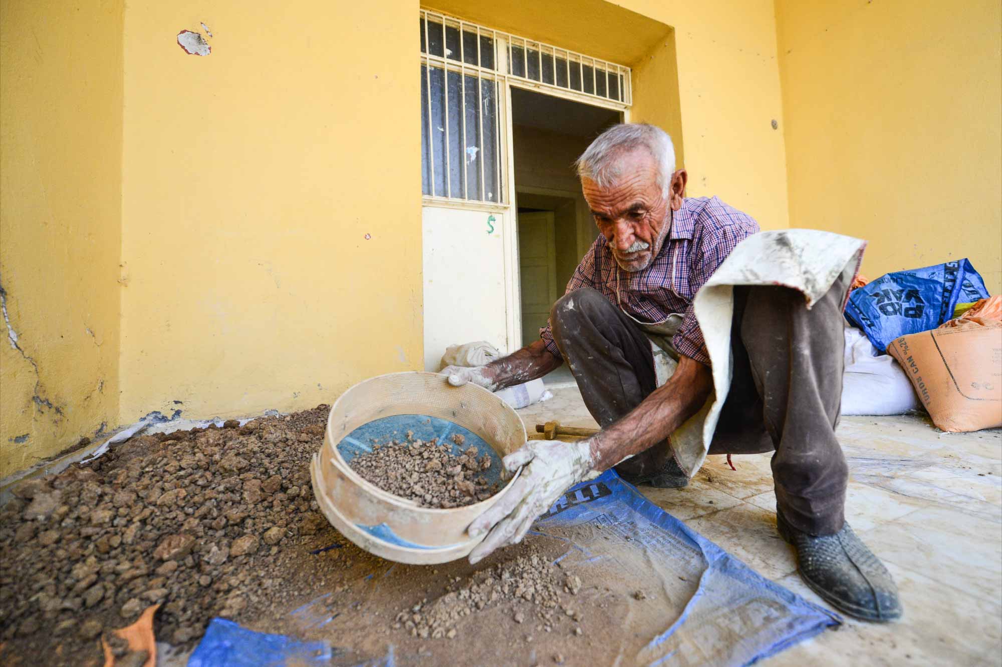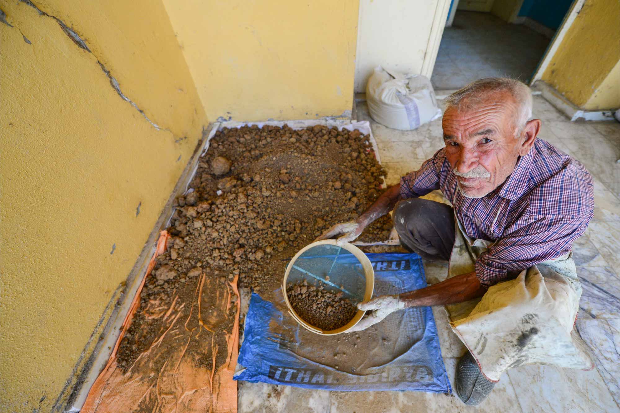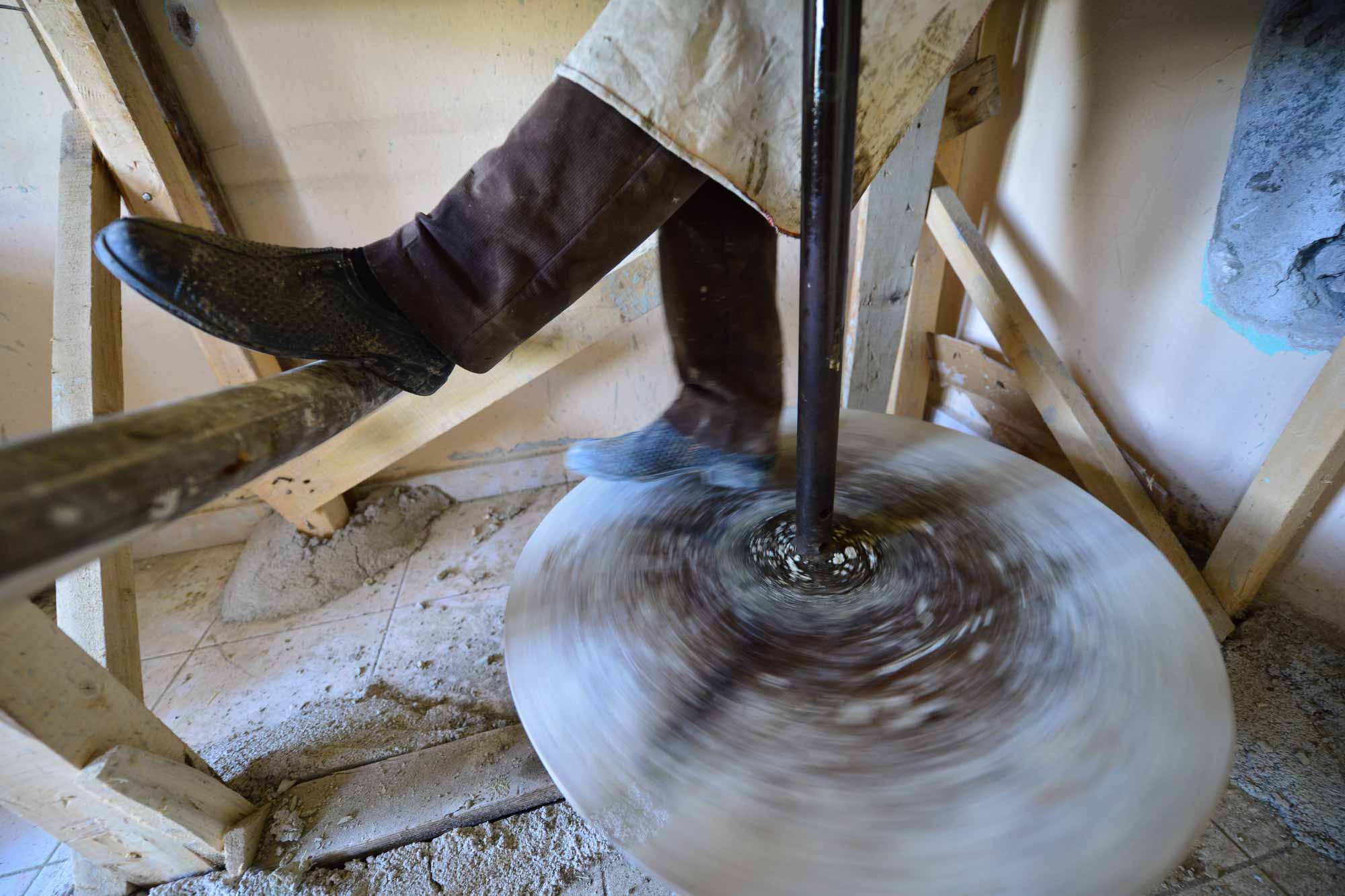 Günün erken saatlerinde uyanarak atölyesine giden Bozkurt, tezgahının başına geçmeden önce çömlek yapımında kullanacağı toprağı çekiç yardımıyla ufaladıktan sonra elekten geçiriyor.