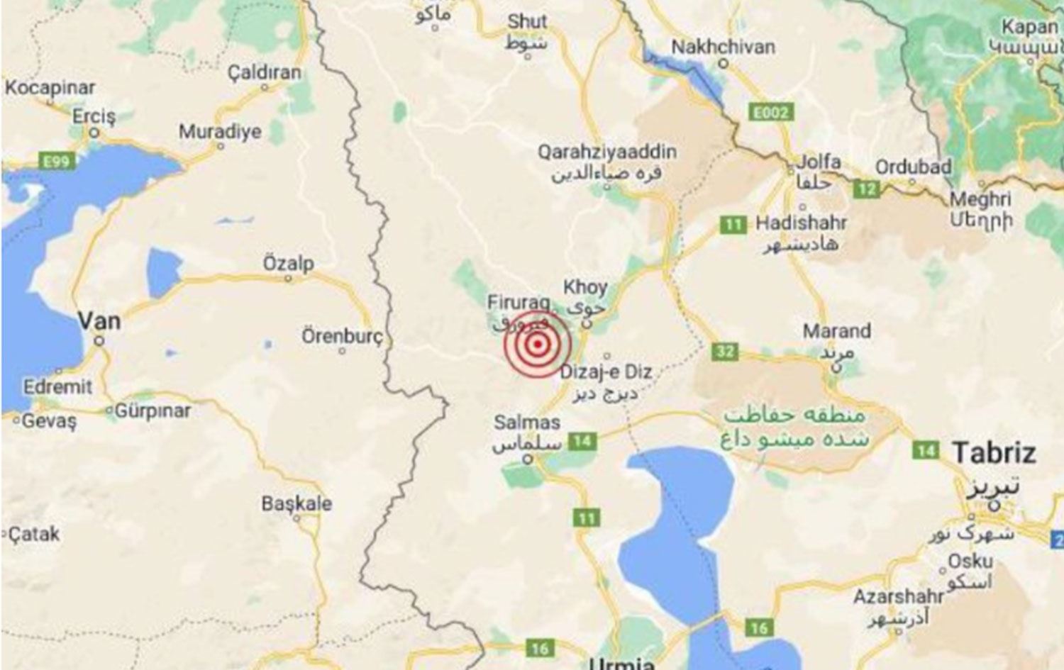 Kandilli Rasathanesi'nin verilerine göre; Van'a 44,85 kilometre uzaklığındaki Rojhılat’ın Xoy şehri merkezli 5,9 büyüklüğünde deprem meydana geldi.