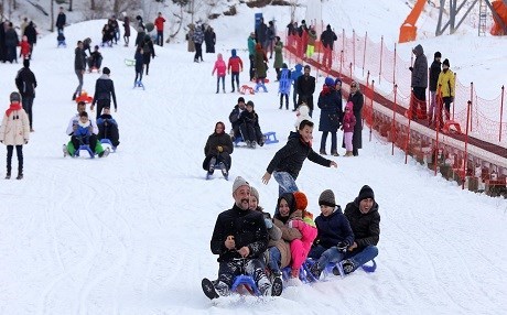 Hafta sonu tatilini fırsat bilen aileler, çocuklarıyla kızaklara binip kayak yapmanın keyfini çıkardı.