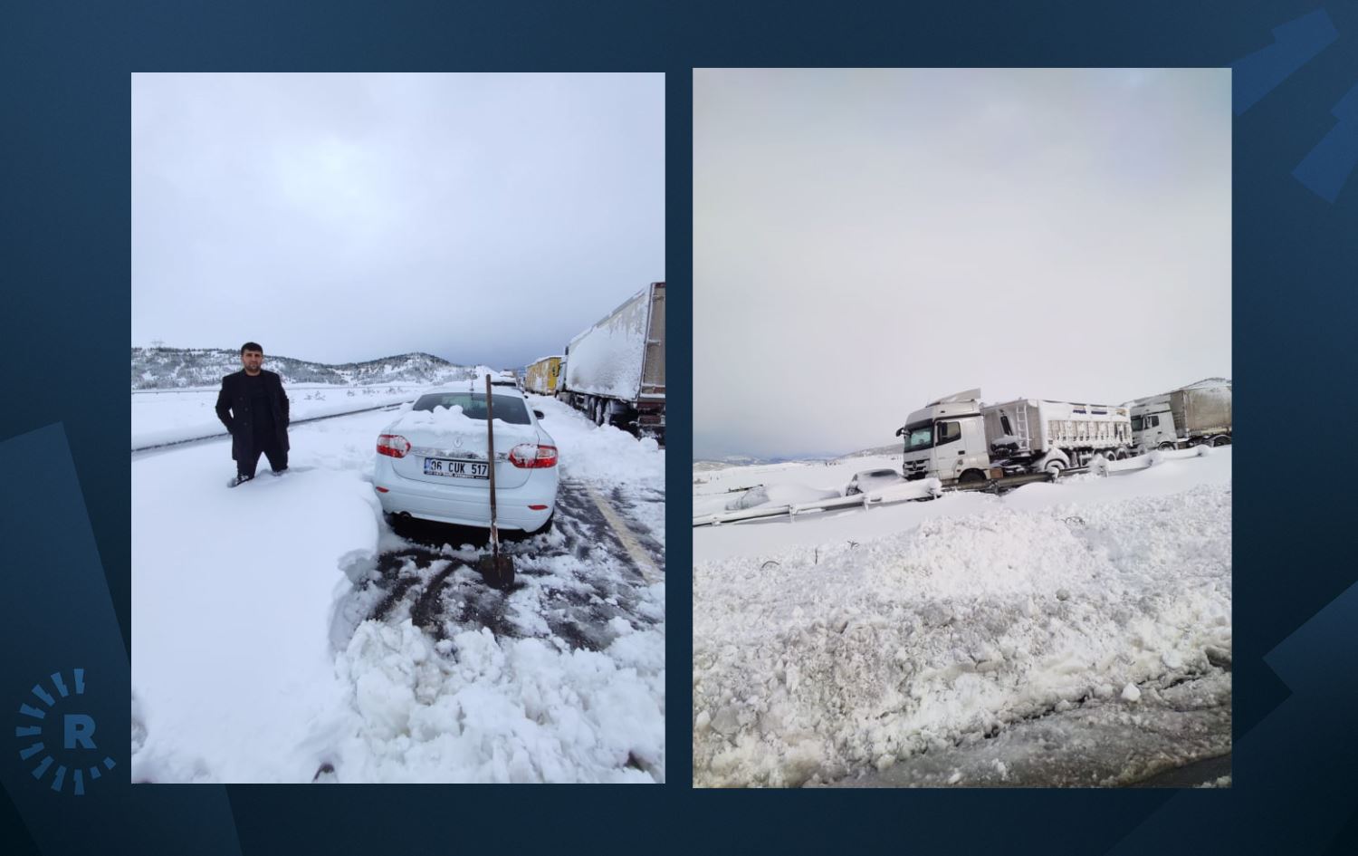 Rûdaw’a konuşan Cengiz Bilyan, 20 saate yakındır Nurdağı’nda mahsur kaldıklarını ve perişan durumda olduklarını söyledi.