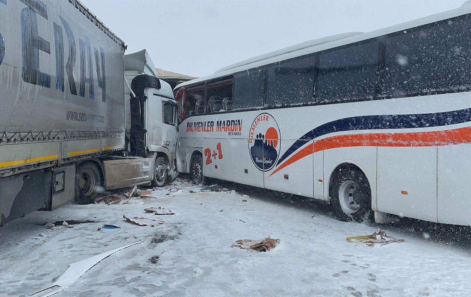 #Mardin'de 4 tır, 1 yolcu otobüsü ve 2 otomobilin karıştığı zincirleme kazadan görüntüler