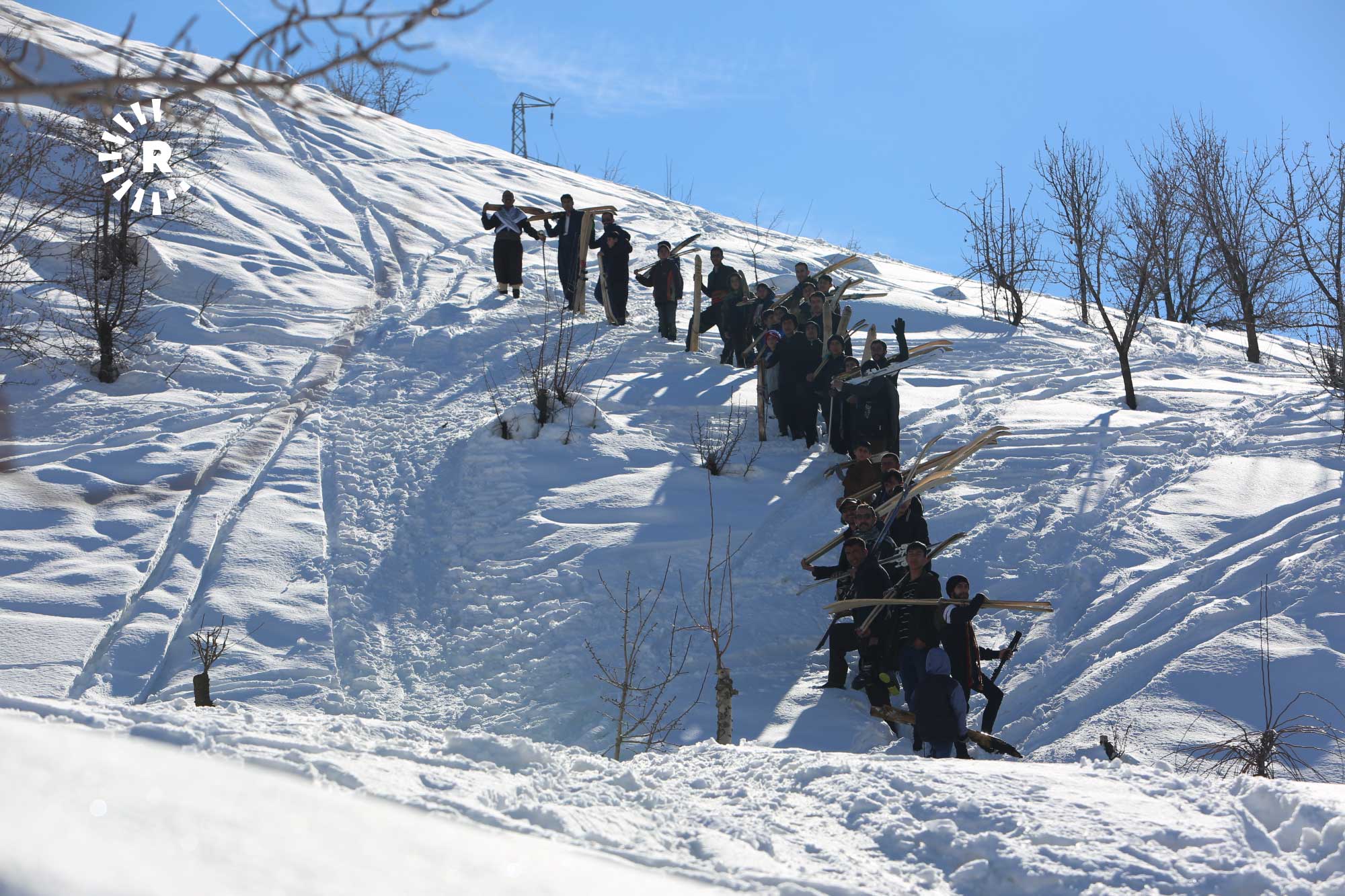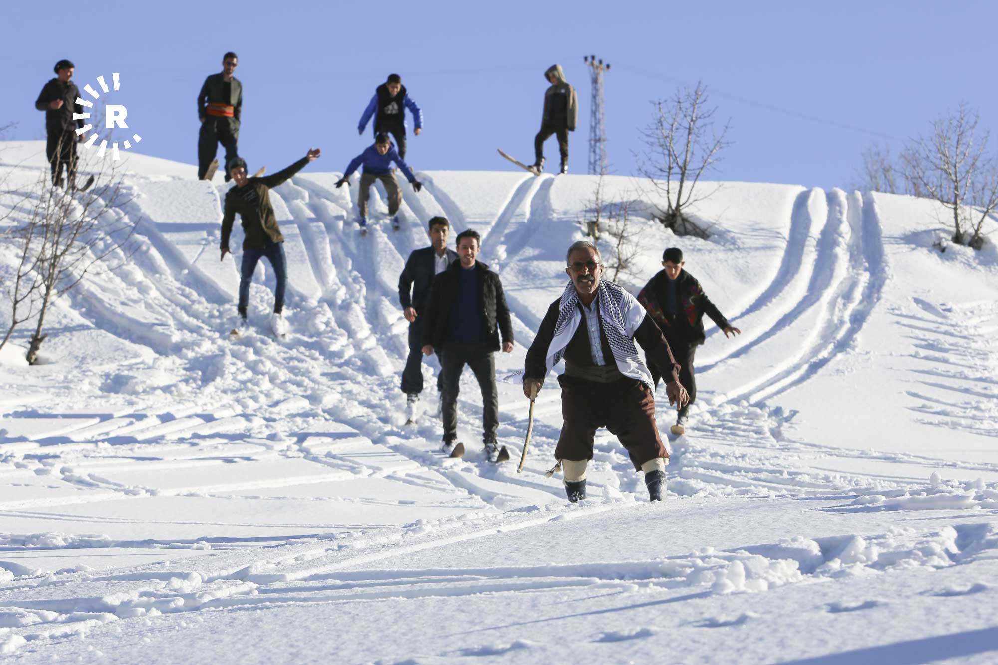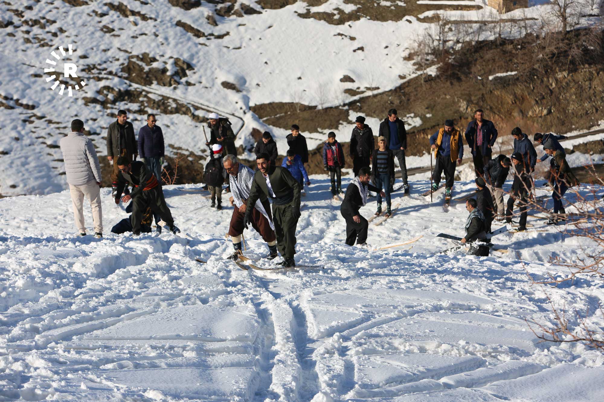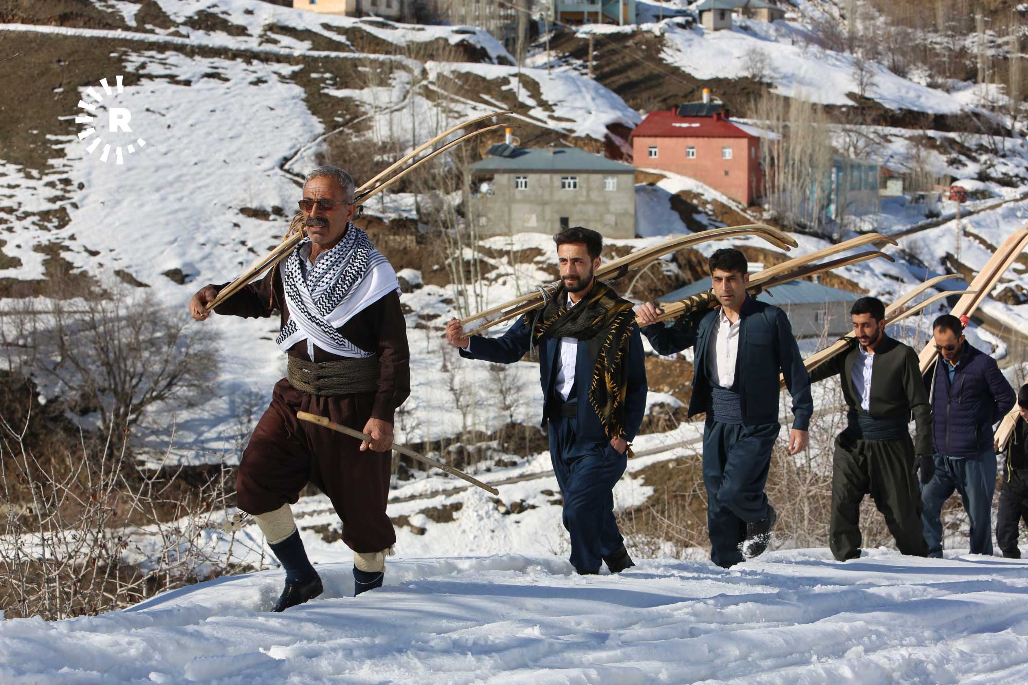 Köyde fırsat buldukça bir araya gelip yaklaşık 2 saatte tırmandıkları karla kaplı tepelerde "liyan" denilen takımı, kayış ve iple ayaklarına sabitleyen gençler, kayarak köyün yakınına kadar iniyor.