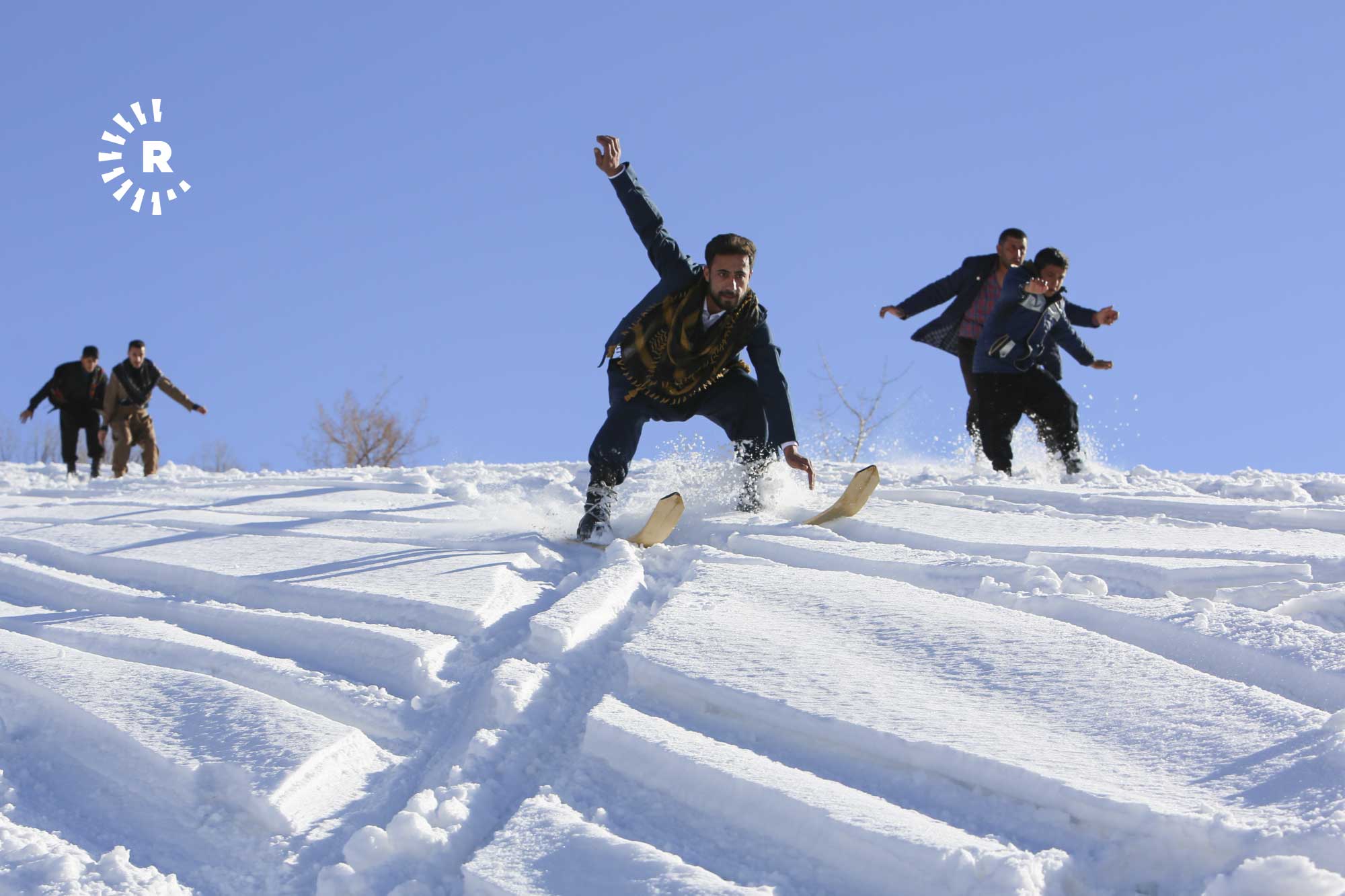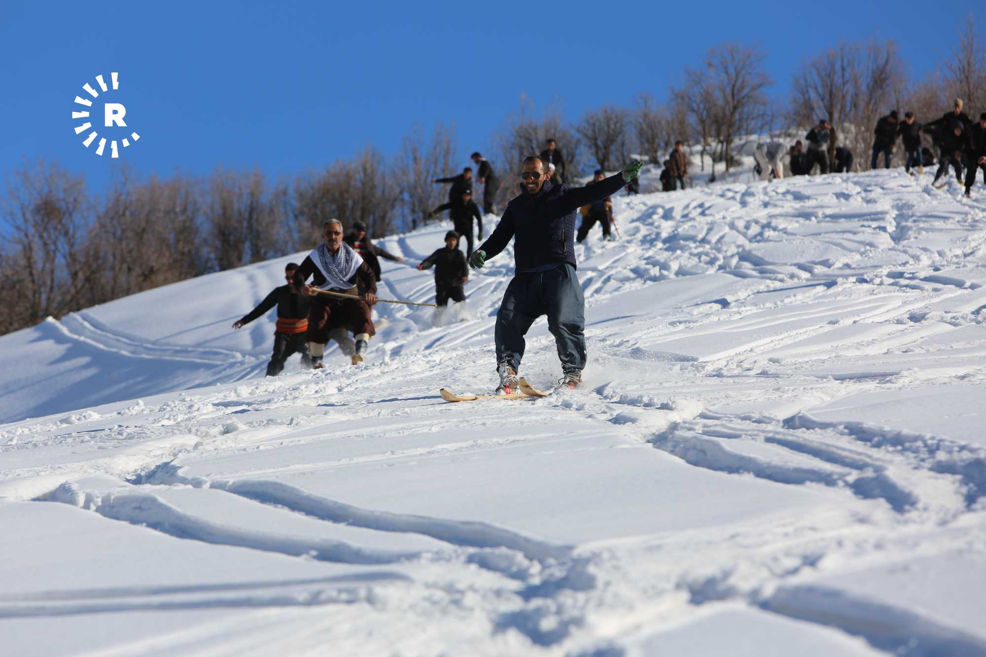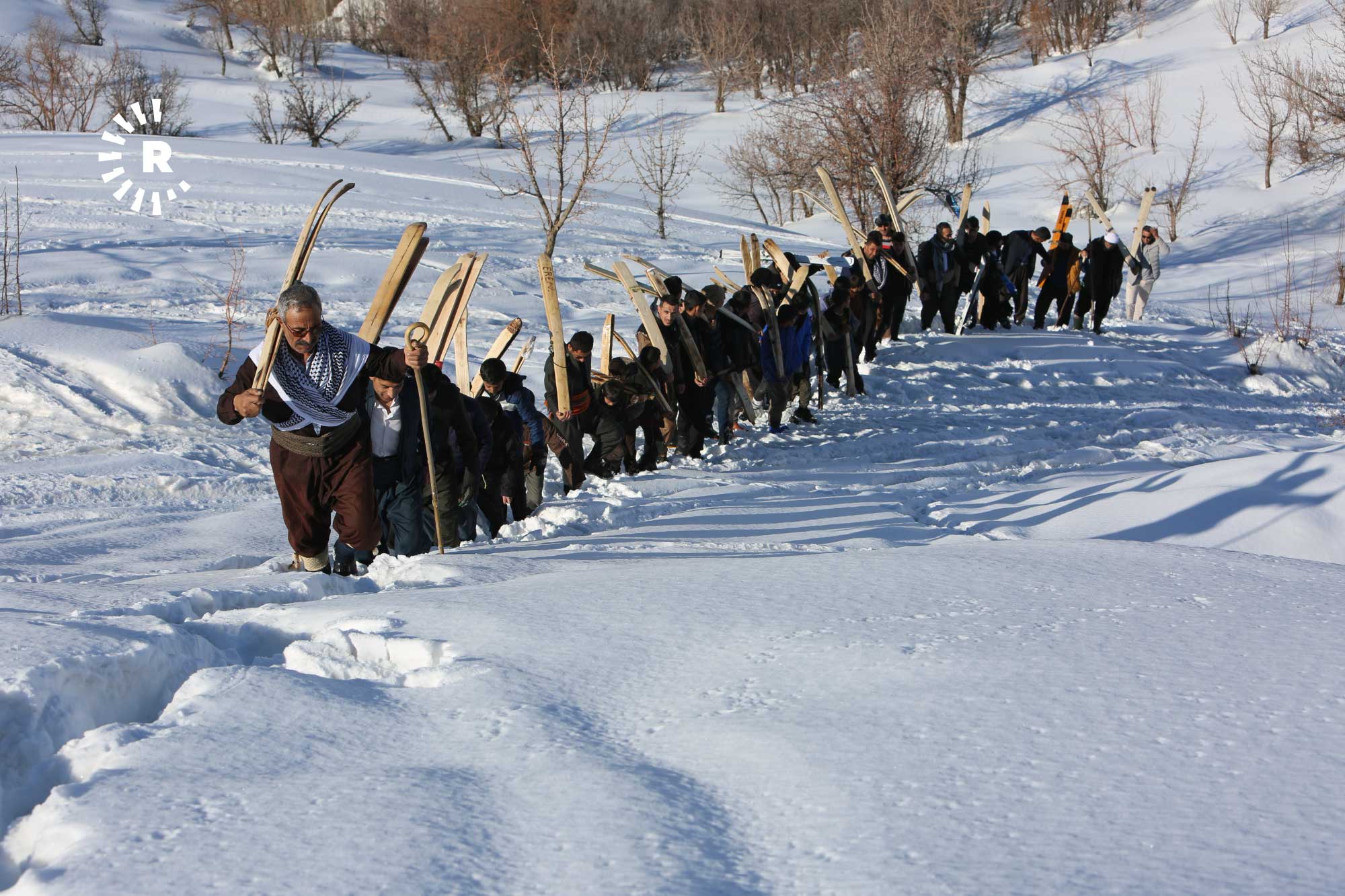 Köyde fırsat buldukça bir araya gelip yaklaşık 2 saatte tırmandıkları karla kaplı tepelerde "liyan" denilen takımı, kayış ve iple ayaklarına sabitleyen gençler, kayarak köyün yakınına kadar iniyor.