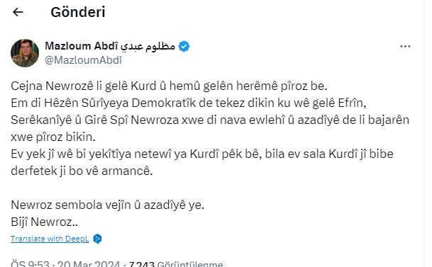 Demokratik Suriye Güçleri (DSG) Genel Komutanı Mazlum Kobani (Abdi), Newroz’a ilişkin bir mesaj paylaştı.