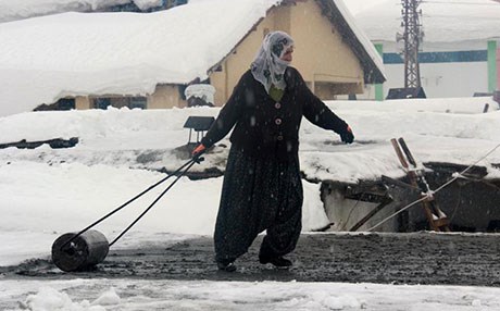 Toprak damın çökmesini önlemek amacıyla sürekli kar temizliği yapanlar, evlerine su sızmaması için de Kürtçe “loğ” olarak bilinen ve toprağı sıkıştırmaya yarayan taş silindirleri kullanıyor.