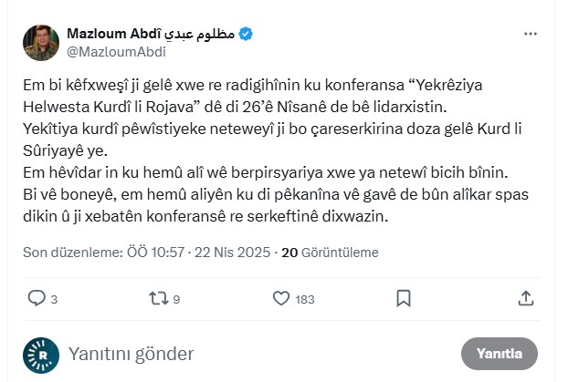 Mazlum Abdi X hesabından yaptığı açıklamada “Rojava Kürt Birliği ve Tutumu” konferansı için tarih verdi.