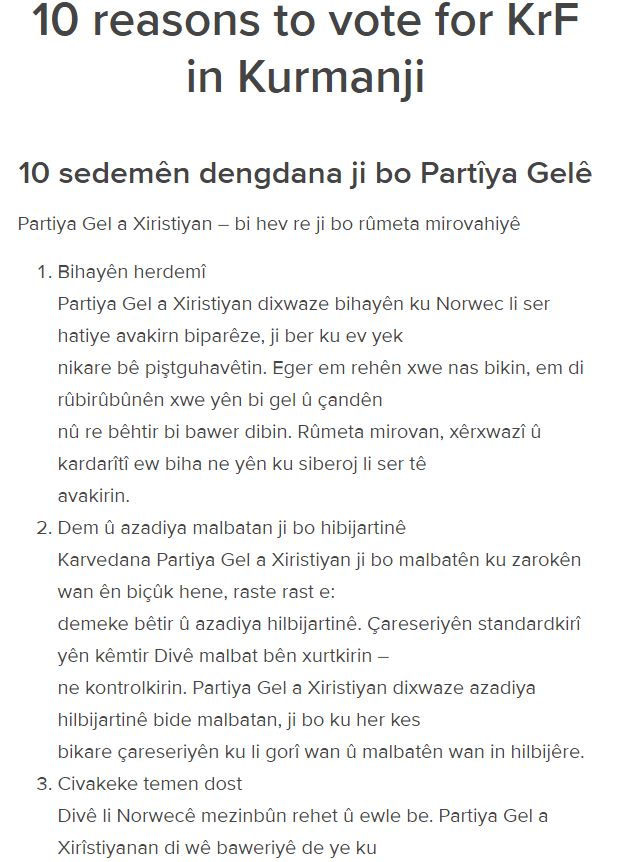 Norveç Hristiyan Halk Partisi, bu yıl 13 Eylül'de yapılan seçimlerde, Norveç değerlerinin korunması, insan hakları, aile planlaması, engelli bireyleri olan ailelere destek, istihdam ve eğitim fırsatlarına yönelik planlarını Kürtçe olarak da açıkladı.
