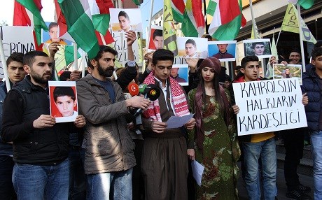 Diyarbakır (Rûdaw) - Tevgera Ciwanên Kurdistan (Kürdistan Gençlik Hareketi) üyeleri, Kürt çocuklarının öldürülmesini protesto etmek için, “Kahrolsun Halkların Kardeşliği” dövizleri ile yürüyüş yaptı.
