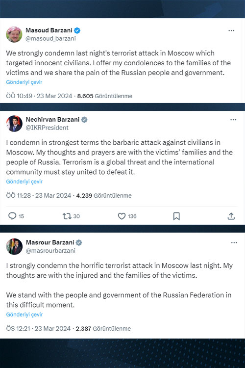 Saldırıyı kınayan Başkan Barzani, “Dün gece Moskova'da masum sivilleri hedef alan terör saldırısını şiddetle kınıyoruz. Kurbanların ailelerine başsağlığı diliyor, Rus halkının ve hükümetinin acısını paylaşıyoruz” ifadelerini kullandı.